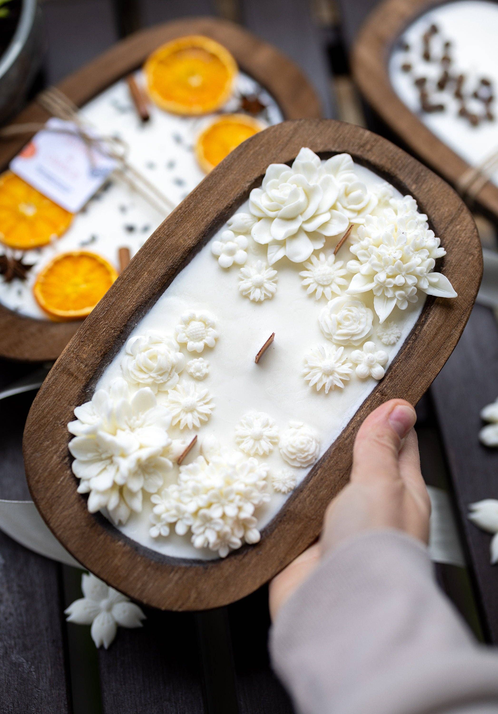 Prachtige dough bowl-kaars met gedroogde rozenblaadjes, een mooie aanvulling op elk interieur, vooral in boerderijstijl. Deze kaars brengt de perfecte zomerse sfeer en is ook een leuk cadeau voor Moederdag. - Gemaakt met drie houten lonten. Neem contact met ons op als je liever een houten of katoenen lont wilt; we veranderen het graag voor je. - De geur is hemels en de kaars bevat echte gedroogde rozenblaadjes. Belangrijke veiligheidsinformatie: Deze kaars bevat echte, droge bloemen die brandbaar zijn. Laat de kaars daarom nooit zonder toezicht branden. Afmetingen: - Lengte: ca. 25,4 cm - Hoogte: 4,4 cm - Breedte: 14,6 cm Let op: Als je de kaars aansteekt, zorg dan dat je de decoratie bovenop verwijdert of regelmatig verplaatst om brand te voorkomen. Gebruik de kaars altijd veilig en op eigen risico.