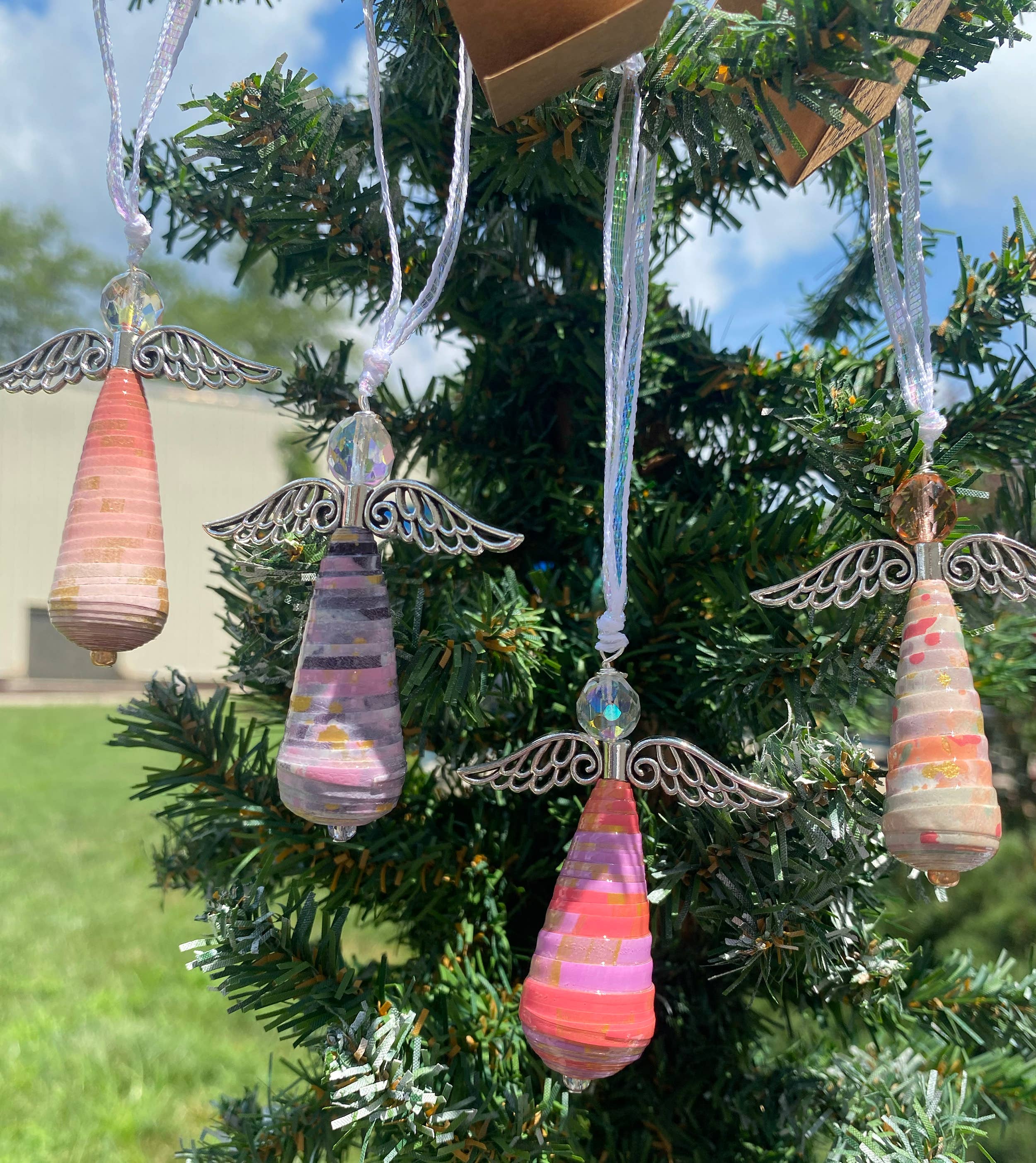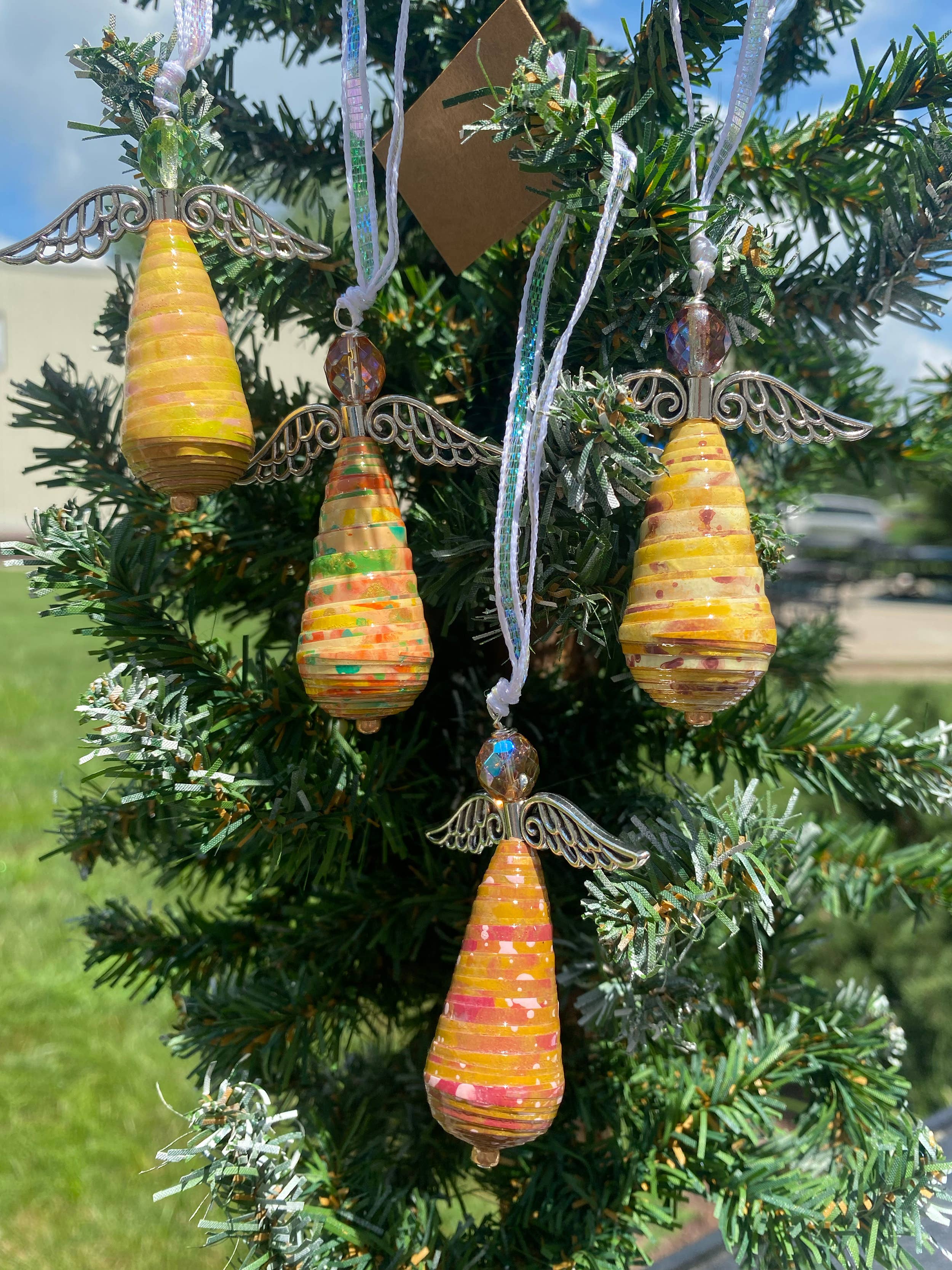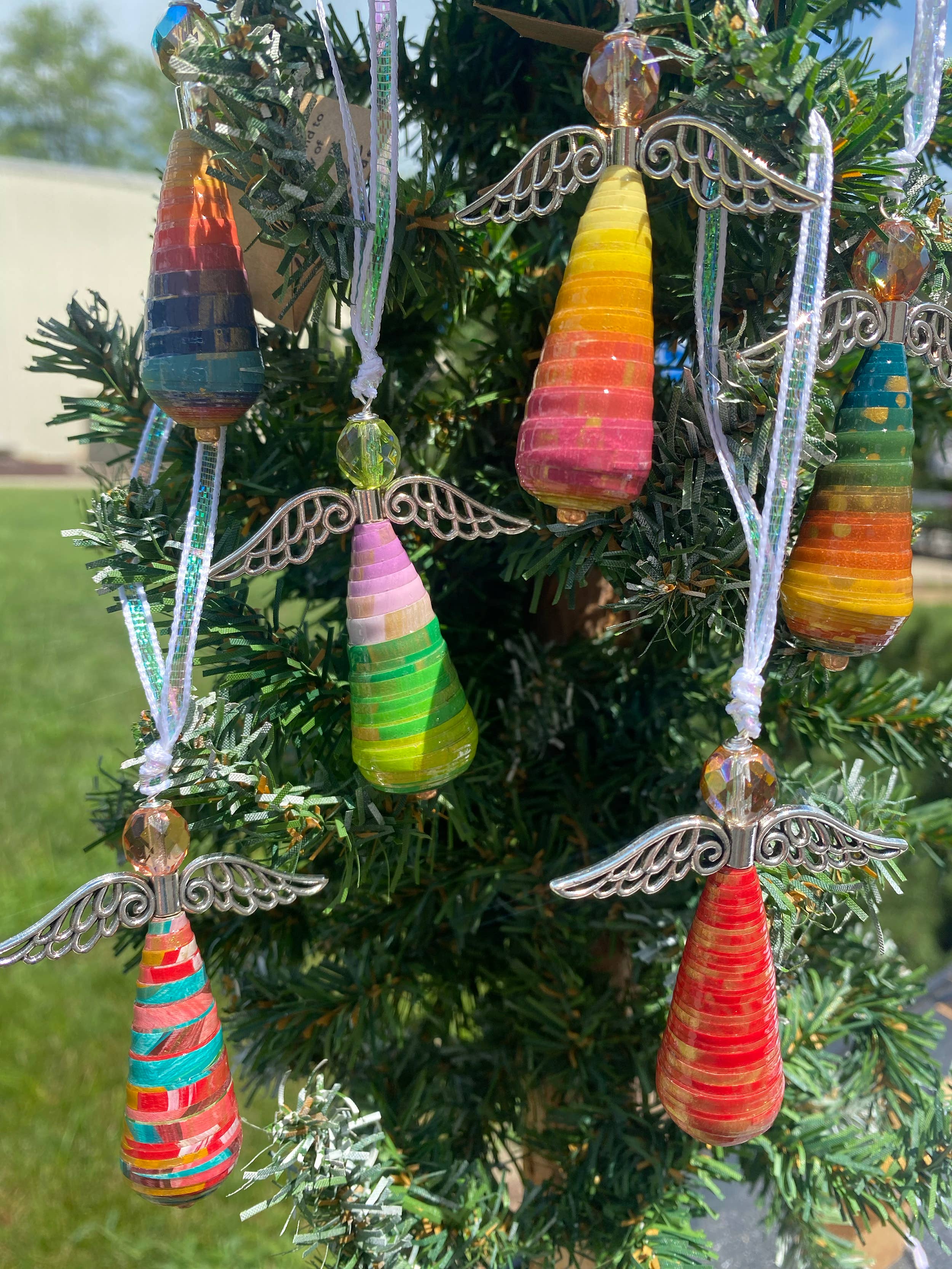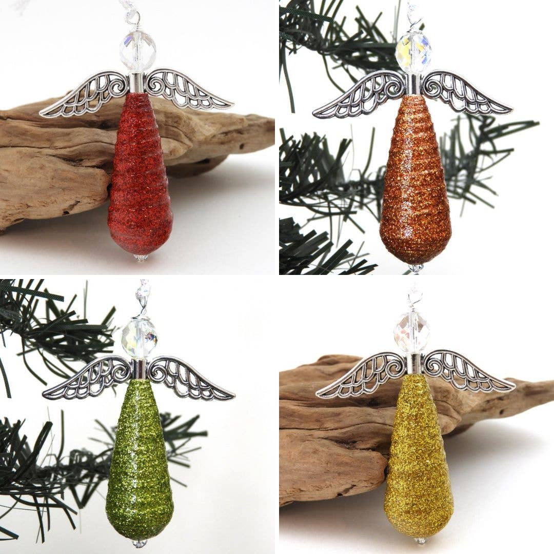 Deze engelenornamenten vormen een harmonieuze combinatie van artistieke expressie en duurzaamheid. Ik heb de engelen gemaakt van upcycled papier dat ik met de hand heb geschilderd met behulp van verschillende technieken gecombineerd met een sterke kleurintuïtie. Nadat de verf is uitgehard, snij ik het papier in reepjes en rol ik er prachtige kralen van. Om hun duurzaamheid te garanderen, bedek ik de kralen met meerdere lagen helder acryl op waterbasis. Ik herhaal geen enkel ontwerp precies zoals het eerder is geverfd, wat resulteert in kleine hoeveelheden in een reeks kleuren en ontwerpen. De ornamenten zijn ongeveer 2,75 cm lang en worden geleverd met een lint om op te hangen en een klein label dat het proces van hun creatie uitlegt. Hoewel ze bij uitstek geschikt zijn voor kerstbomen, hebben deze ornamenten de blijvende kwaliteit die ze tot zinvolle herinneringen maakt voor een groot aantal gelegenheden. Je bestelling bevat een assortiment van 10 engelen. Zie mijn andere aanbiedingen voor een prijsverlaging voor grotere hoeveelheden.