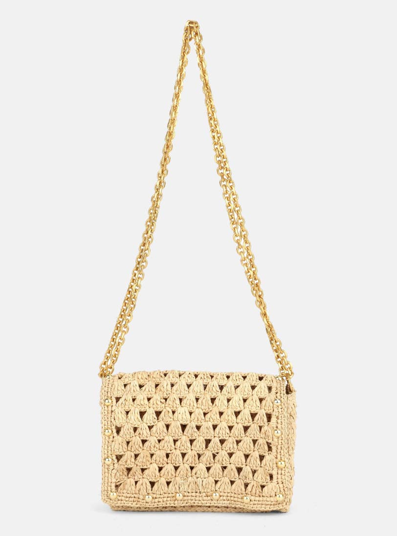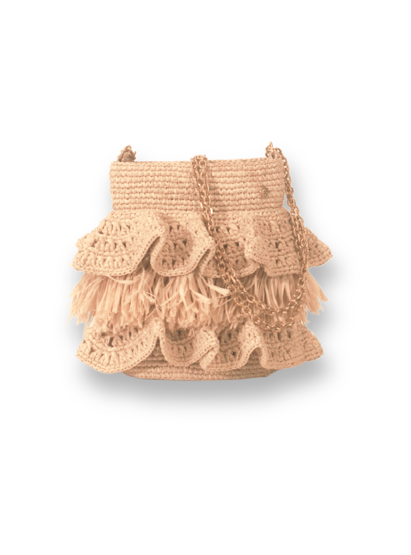 We houden van de details van deze tas van natuurlijke raffia met 3D-bloemen die toon op toon zijn gehaakt. Lichte verfijning voor deze ronde tas van raffia die over de schouder kan worden gedragen en perfect is voor je zomerse looks. Omschrijving Doorsnee 17 cm Recyclebare gouden ketting Fabricage Natuurlijke raffia handgemaakt
