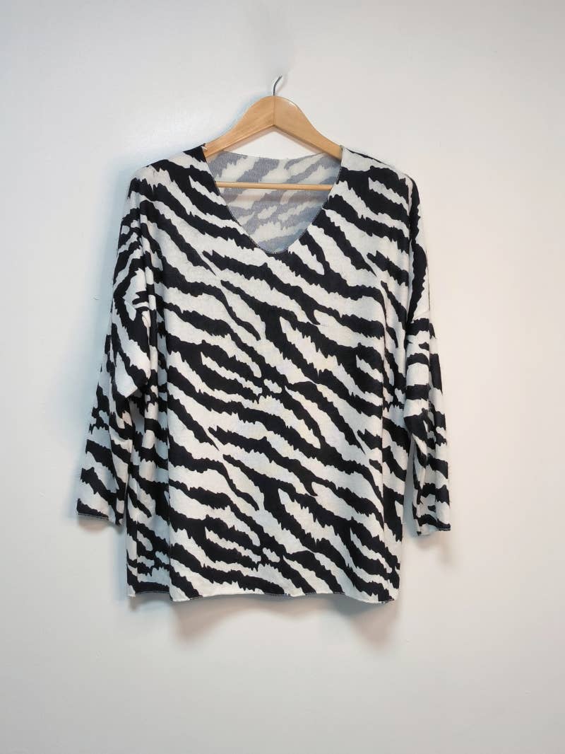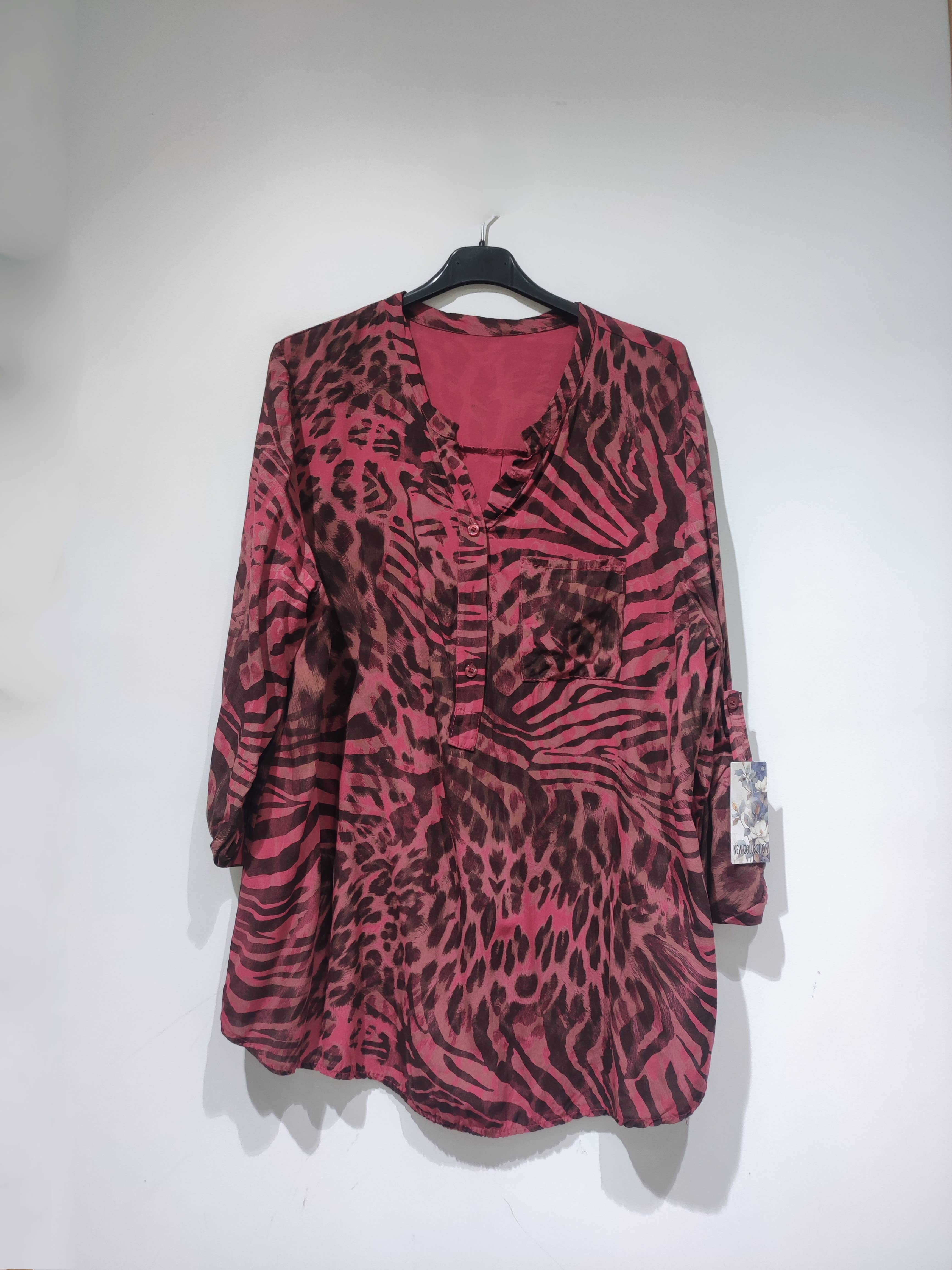 SAMENSTELLING: 100% viscose Rita tiger blouse met uitlopende pasvorm, V-hals, lange mouwen en elastaan aan de uiteinden. Voorzijde ongeveer 70 cm lang. Maximale borstomvang: 120 centimeter. Geschikt voor maten 36 tot 46.