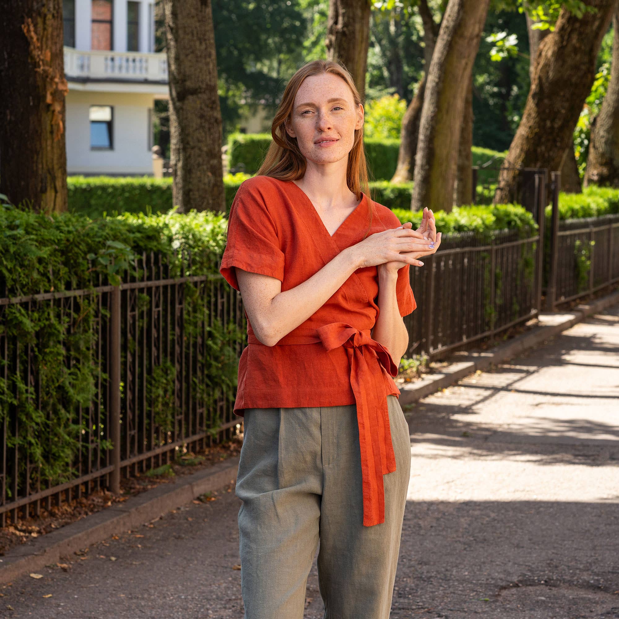 ❤️ BESCHRIJVING Deze organische jurk is voorzien van een unieke, in de stof genaaide obi-riem die je taille prachtig accentueert en zo een elegante zandloperfiguur creëert. Het praktische ontwerp heeft twee zijzakken en subtiele zijsplits, wat bijdraagt aan de verfijnde uitstraling en tegelijk zorgt voor bewegingsvrijheid. ✔️ Flatterende, rondom te wikkelen obi-riem (ingenaaide stijl). ✔️ 3/4 mouwen, midilengte zomerjurk. ✔️ A-lijn, zijsplitsen en twee zakken. ✔️ Gewassen linnen stof van gemiddeld gewicht, 200 gsm. 👉 Het eerste model draagt de kleur Stone Green. Model is 178 cm lang en draagt maat S; Borstomvang 89 cm; Taille 66 cm; Heupen 96 cm. 👉 Het tweede model draagt de kleur Cobalt Blue. Model is 176 cm lang en draagt maat S; Borstomvang 85 cm; Taille 66 cm; Heupen 92 cm. 🎨 Als je gewenste kleur er niet bij zit, bekijk dan ons volledige kleurenpalet in de productfoto's. Meer opties zijn beschikbaar bij grotere bestellingen. Neem contact op met de klantenservice voor meer informatie.