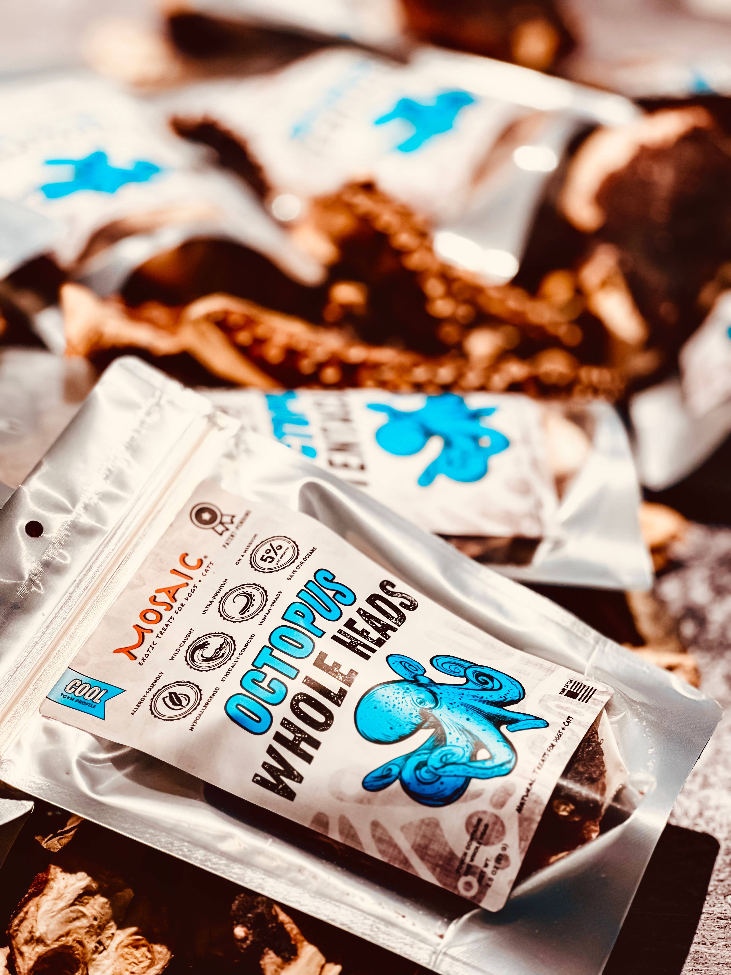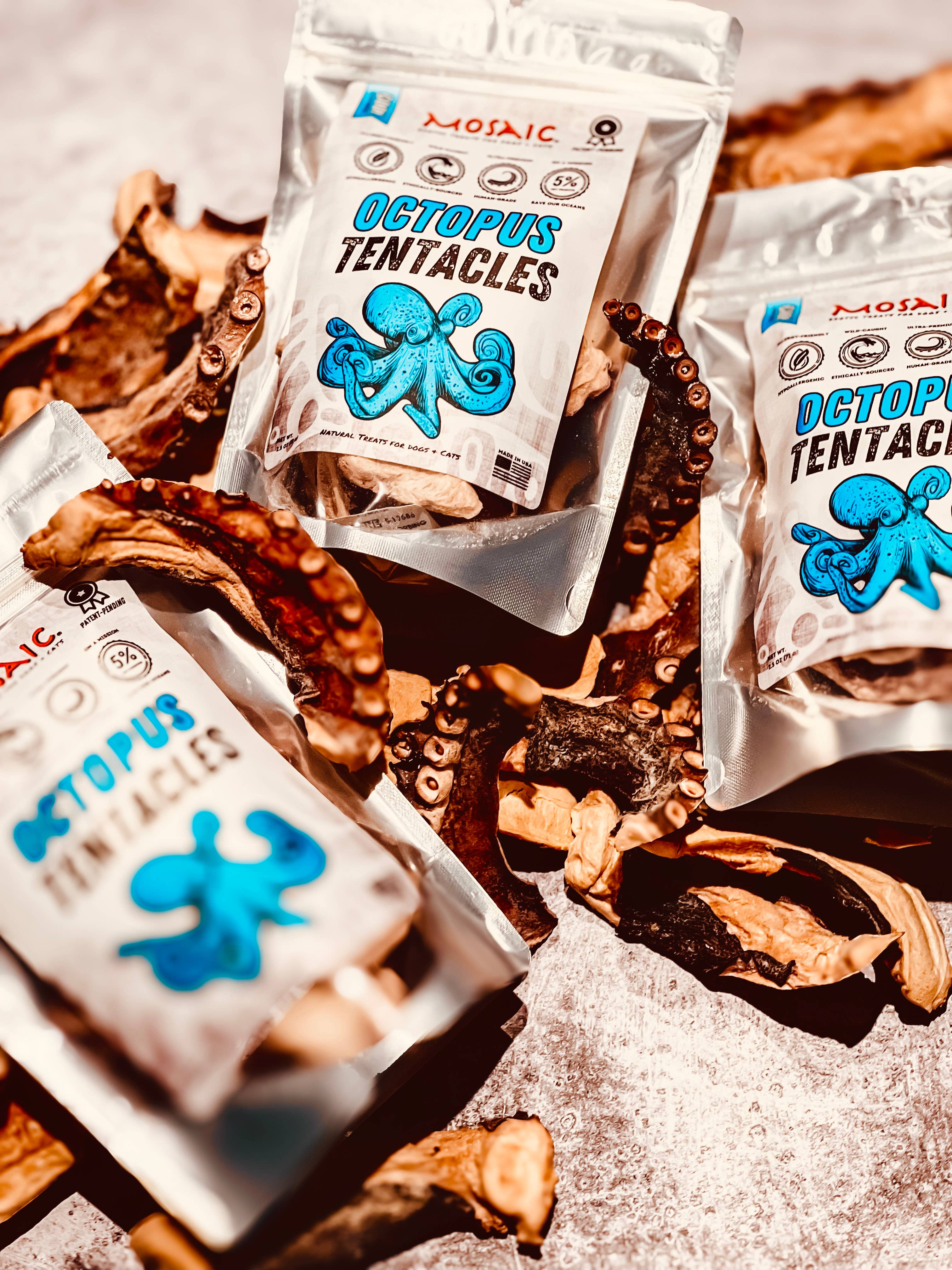 * In bulk aangeboden voor bulkdisplays. Blijf uit de buurt van vochtplekken. Mosaic is NIET verantwoordelijk voor problemen met de kwaliteitscontrole als gevolg van omgevingen met een hoog waterpeil, waaronder het snuiven/proeven van huisdieren. 1 pond = ongeveer 64 plakjes kop Mosaic Wild-Caught Octopus Head Slices zijn een perfect alternatief voor honden en katten die last hebben van voedselallergieën, zoals kip, rund- en varkensvlees. Deze kauwsnacks van menselijke kwaliteit met één ingrediënt worden op verantwoorde wijze gedroogd volgens een proces waarvoor een strikt patent is aangevraagd. Octopus is rijk aan eiwitten en omega-3-vetzuren, wat helpt om obesitas bij honden te voorkomen en huidaandoeningen en spijsverteringsproblemen verbetert. Onze octopussen zijn duurzaam geproduceerd en op verantwoorde wijze in het wild gevangen in Spanje, door gebruik te maken van de beste praktijken. De octopus wordt in het wild gevangen in hun natuurlijke omgeving en is vrij van groeihormonen en antibiotica. Ingrediënten: Octopus. Gegarandeerde analyse: Ruw eiwit: 87% min Ruw vet: 3% min Ruwe celstof: maximaal 0,4% Vochtgehalte: max. 3% 3.329 Kcal/kg, gemiddeld 23 calorieën per plak.