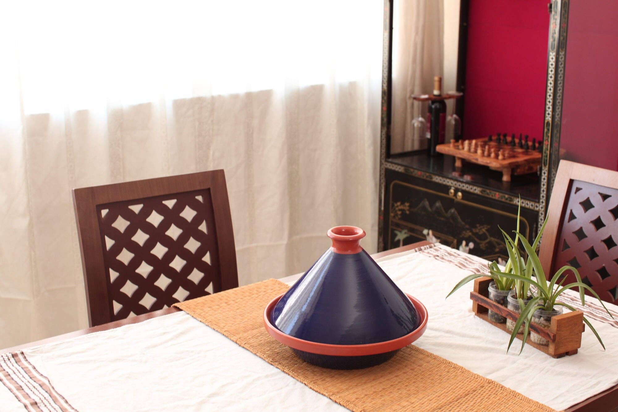 Handgemaakte Boheemse tajinepot — Ambachtelijk kookgerei voor authentieke Noord-Afrikaanse gerechten 🍲 Breng mediterraan erfgoed naar je keuken met onze Bohemian Tagine Pot, verkrijgbaar in drie levendige ontwerpen: Boheems blauw, Boheems turkoois en Boheems rood. Perfect voor het bereiden van smaakvolle Marokkaanse gerechten en als mooi middelpunt voor je tafel. ✨ Details van het product: Beschikbare maten: Gemiddeld: 10" diameter, 10" hoogte Groot: 12" diameter, 12" hoogte Handgemaakte uitmuntendheid: Gemaakt door Tunesische ambachtslieden van 100% Europese vuurklei, met de hand beschilderd met levendige kleurstoffen op basis van mineralen. Duurzaamheid en veiligheid: ovenbestendig tot 650° F, magnetron- en vaatwasmachinebestendig. Loodvrij en milieuvriendelijk, wat zorgt voor een gezonde kookervaring. Fair Trade-gecertificeerd: ondersteunt eerlijke lonen en ethische werkomstandigheden voor ambachtslieden in Tunesië. Belangrijkste kenmerken: Authentieke kookervaring: het conische dekselontwerp laat stoom circuleren, waardoor elke keer malse, smaakvolle maaltijden worden geserveerd. Veelzijdig gebruik: ideaal voor langzaam koken