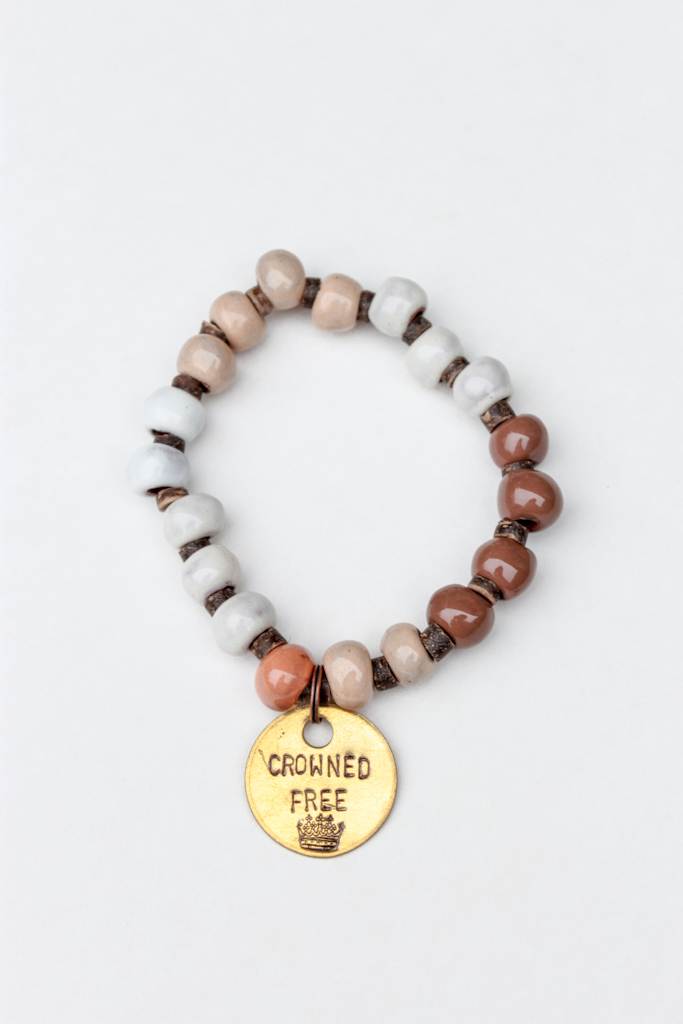 -Ethisch gemaakt in Haïti -Geschilderde klei met keramische glazuur en kokosnootkralen -Messing handgestempelde bedel met Crowned Free-logo -Elke kraal wordt met de hand gerold met klei uit het centrale plateau van Haïti -7" stretch armband Op een missie om een einde te maken aan mensenhandel door middel van ethische mode en geschenken. Bij Crowned Free zetten we ons in om bewustwording te vergroten, veilige en duurzame banen te bieden om overlevenden te versterken, ethische inkoop voor onze producten te kiezen en terug te geven aan anti-mensenhandelorganisaties, zowel lokaal als wereldwijd.