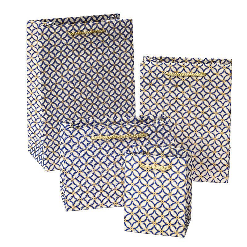 Chic en duurzaam, onze Trellis Print cadeautassen hebben een tijdloos rasterontwerp in diepblauw en goud, handgemaakt van milieuvriendelijk gerecycled papier. Voeg een vleugje elegantie toe aan elke gelegenheid met onze handgemaakte Trellis Print cadeautassen, met een eigentijds raster-geïnspireerd patroon in rijke blauwe en gouden tinten. Deze opvallende tassen zijn ideaal voor kerstcadeaus, feestelijke verpakkingen of alledaagse luxe inpakpapier. Gemaakt van ons kenmerkende handgemaakte gerecyclede inpakpapier, zijn deze tassen een stijlvolle en milieubewuste vervanging voor traditioneel inpakpapier. Ze worden geleverd met touwhandvatten en interne verstevigingen voor extra structuur en een premium gevoel. Een enkele bestelling bestaat uit een pakket van 12 in de geselecteerde maat. Afmetingen: Mini cadeautas: 3,25″ x 4,5″ Kleine cadeautas: 5” x 7″ Middelgrote cadeautas: 6″ x 8″ Grote cadeautas: 7″ x 10″