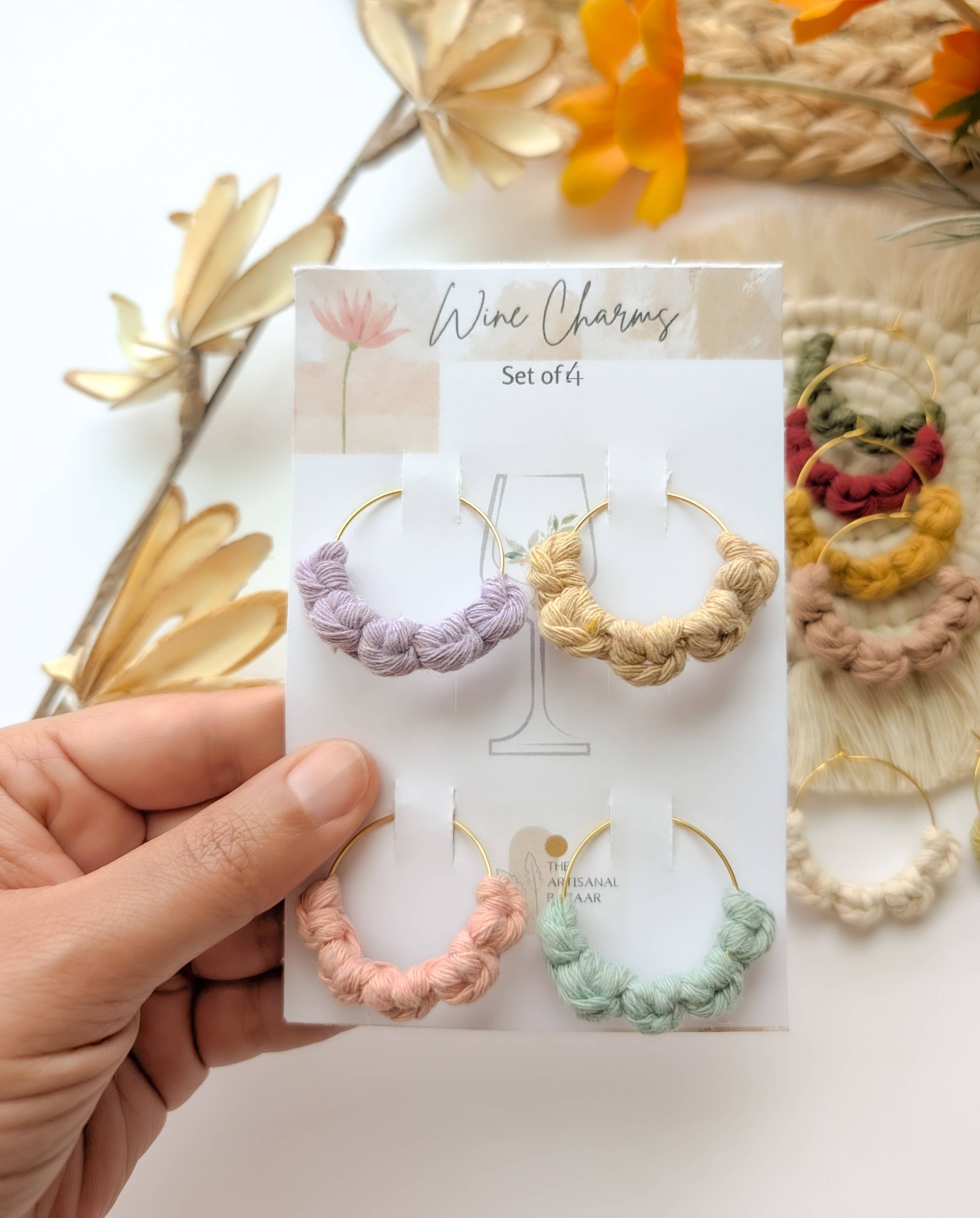 Handgemaakte macramé wijnglasbedels/markeerders - set van 4