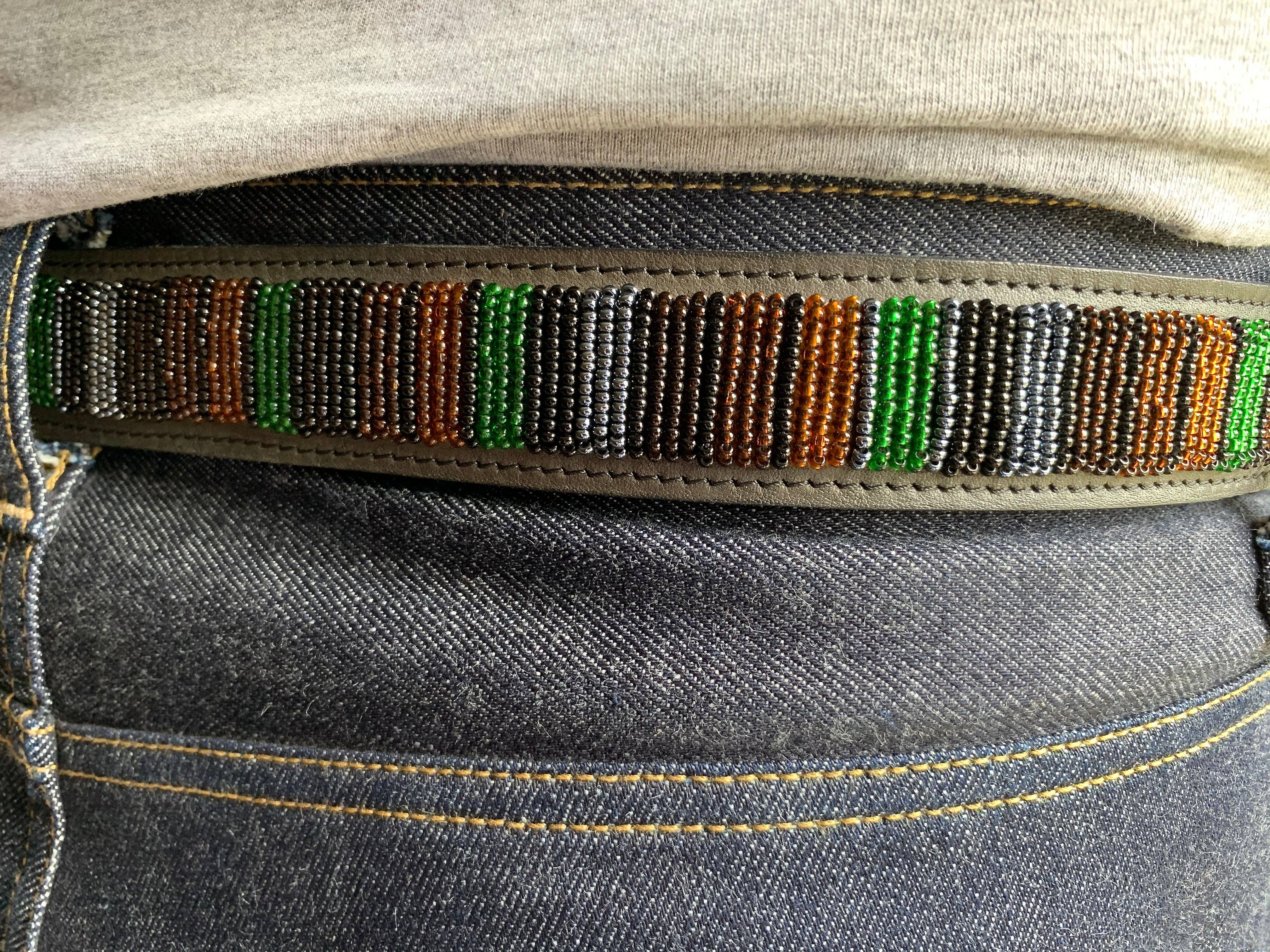 Momenteel OP VOORRAAD voor geselecteerde maten Heldere, regenboogstrepen op ons prachtig zachte maar toch stoere, buigzame zwarte leer: een ongelooflijk opvallende halsband die er prachtig uitziet bij zwarte, witte en veelkleurige honden. Al onze kragen en riemen worden geleverd in een prachtige Afrikaanse stoffen tas met trekkoord, genaaid door Grace, om het perfecte cadeau te maken. (De stof van de tas kan variëren, maar ze zijn allemaal mooi). ... en je zult weten dat terwijl je hond deze halsband draagt, je de ambachtsman die hem heeft gemaakt al helpt met inkomen om haar gezin te onderhouden met voedsel, kleding en schoolgeld voor haar kinderen. En voor onze semi-nomadische ambachtslieden help je ook rechtstreeks om dieren in het wild in afgelegen gebieden van Kenia te ondersteunen door inkomsten te verstrekken waar deze veehouders anders geen toegang toe zouden hebben.