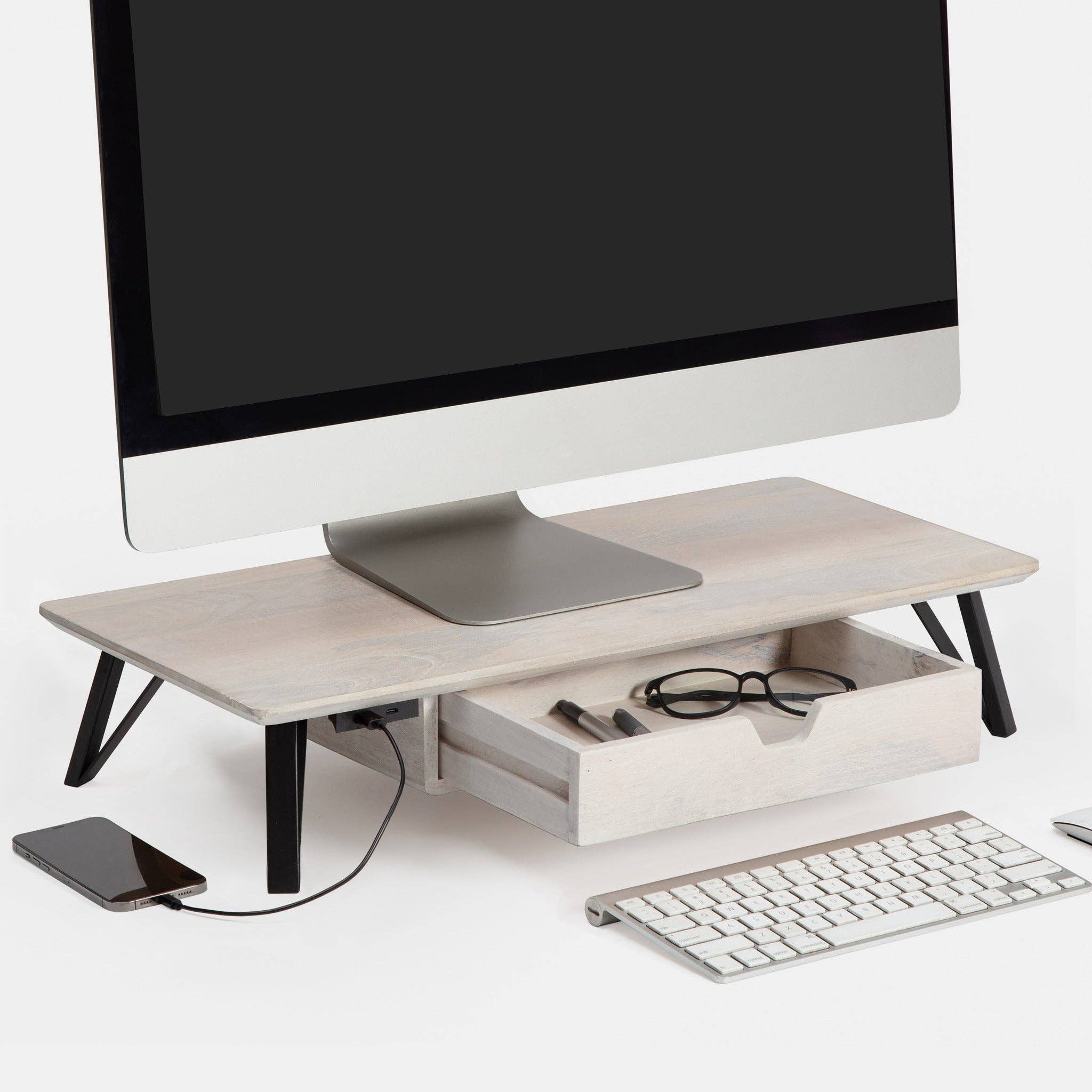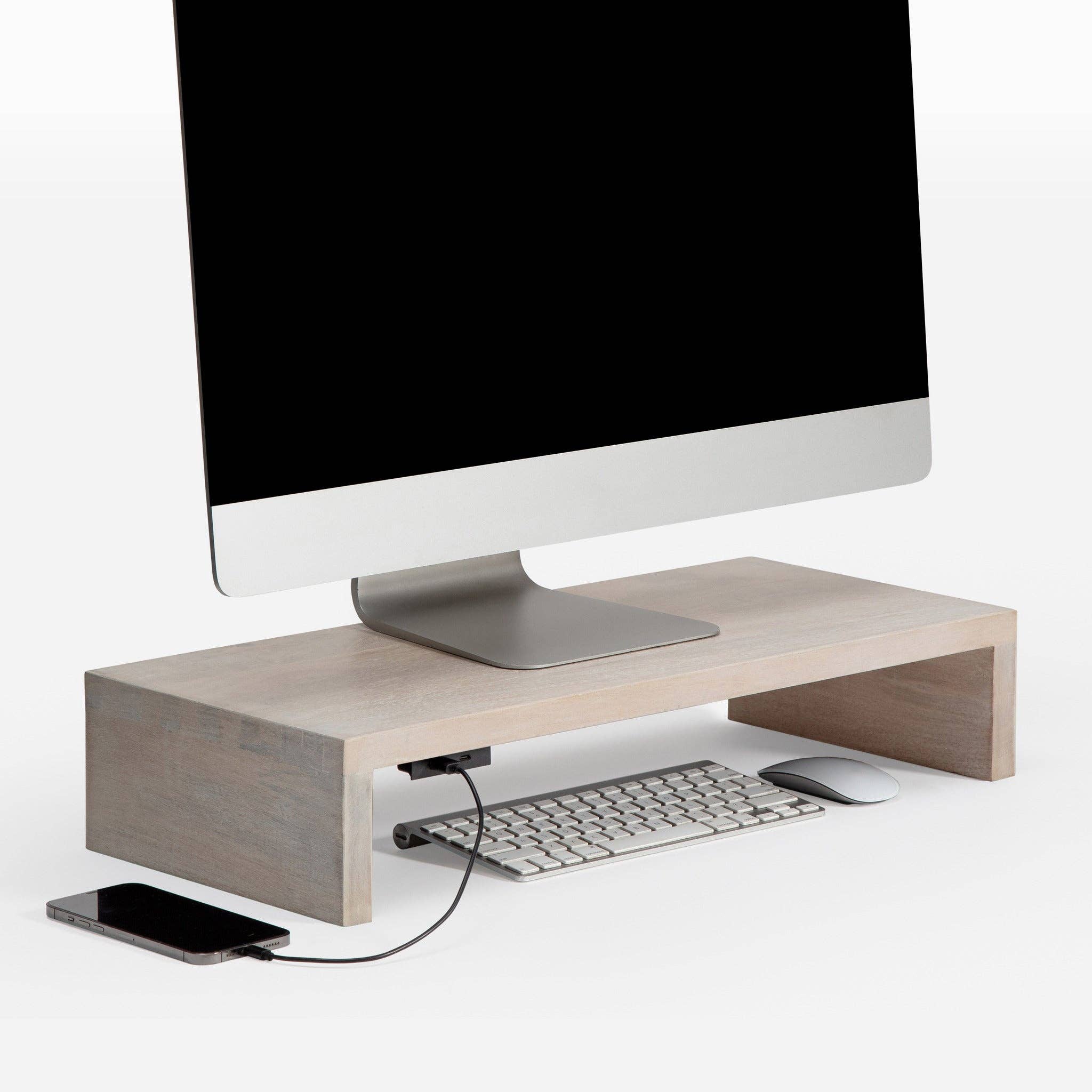 Verhoog uw werkruimte met de moderne monitorstandaards van Anji Mountain, waar stijl en ergonomie samenkomen. Gemaakt met een romige, biscotti-afgewerkte mangohouten bovenkant en stevige gepoedercoate stalen poten, passen deze standaards moeiteloos bij elk bureau en bevorderen ze een gezondere en productievere werkomgeving. Ontworpen om uw comfort te verbeteren, verhogen onze monitorstandaards uw schermen tot de perfecte kijkhoogte, waardoor nek- en oogbelasting wordt verminderd. De ingebouwde lade biedt handige opbergruimte voor werkaccessoires, zodat uw bureau georganiseerd blijft. Voor extra functionaliteit kiest u het model met stroomvoorziening en twee USB-aansluitingen (één Type A, één Type C) voor eenvoudig opladen. Zowel de standaard- als de stroomvoorzieningsmodellen ondersteunen tot 10 kilogram, waardoor ze geschikt zijn voor een breed scala aan monitoropstellingen. Ervaar het verschil van Anji Mountain en creëer een werkruimte die net zo stijlvol als functioneel is.