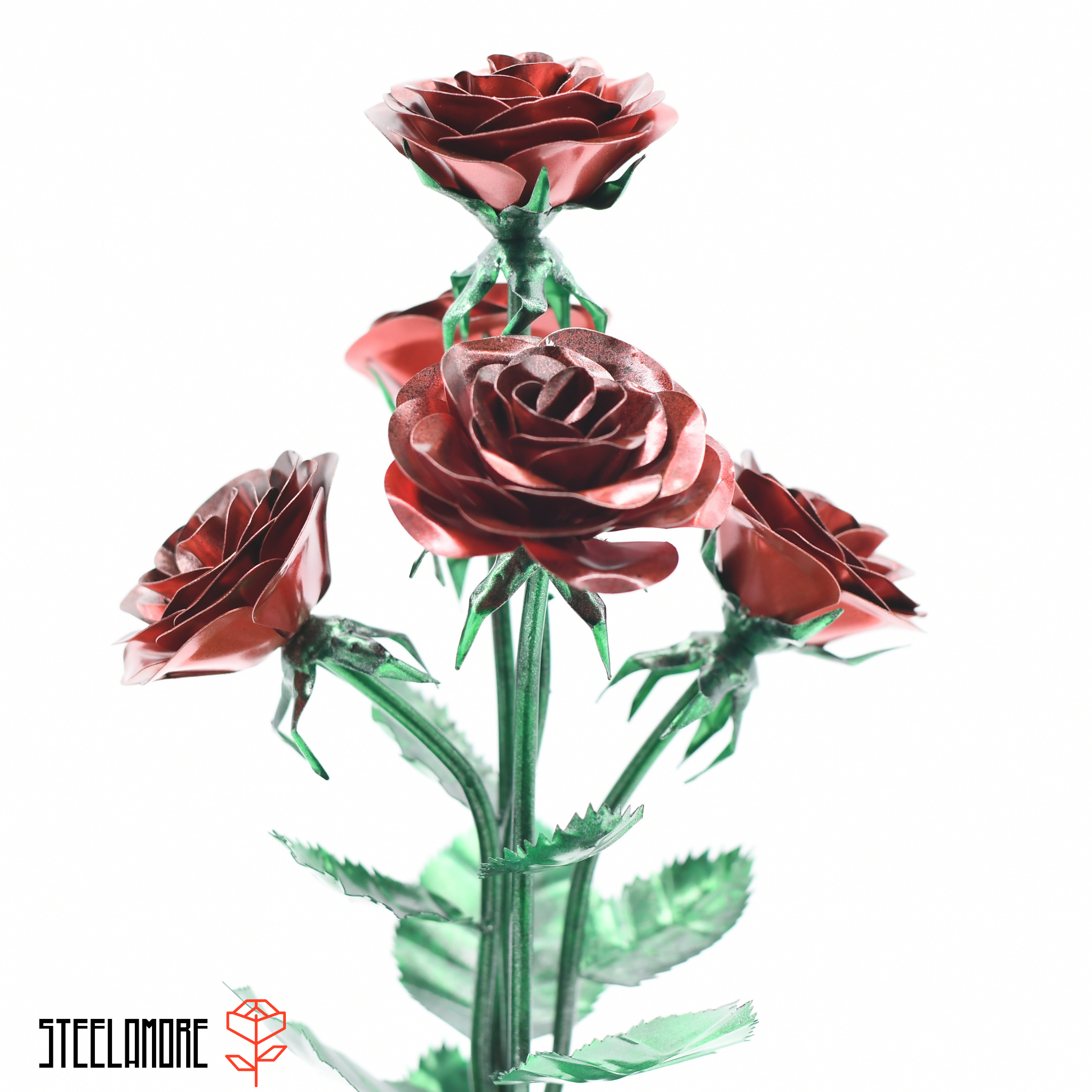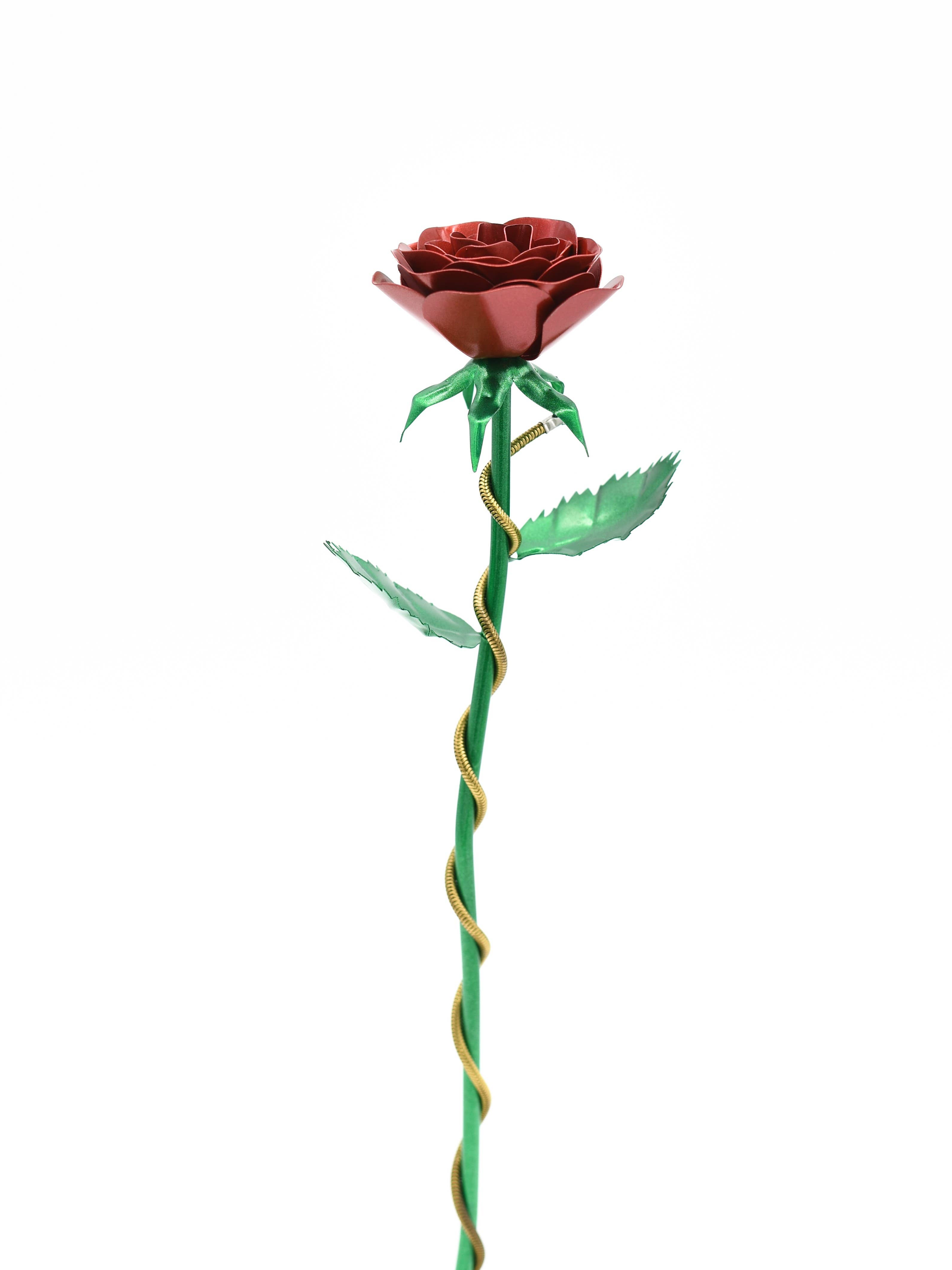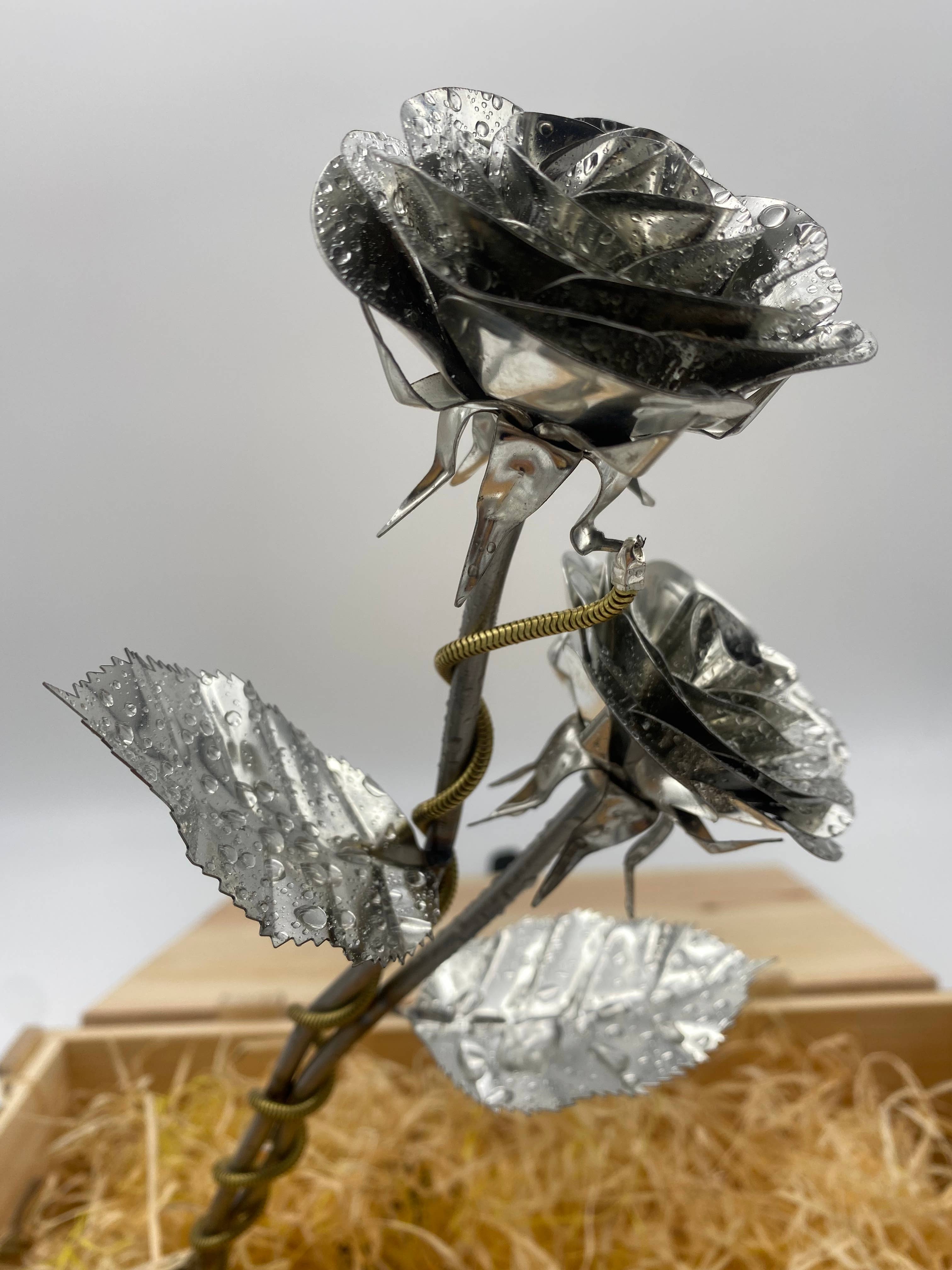 In deze productvariant ontvangt u: - Een boeket van drie tot vijf rozen met een lengte van 40 cm - Indien gewenst ook omwikkeld met een decoratieve ketting van non-ferrometaal. - Het staal is door ons geprimed en beschilderd met verschillende verflagen volgens de typische roze kleur en vorm. - Het uiteinde is een blanke vernislaag, die de rozen verzegelt. - Elk rozenboeket weegt ongeveer 800 - 1.000 gram door het staal. Net als in de natuur is elke roos uniek in ons. We produceren geen massaproductie, dus elk boeket rozen ziet er een beetje anders uit.