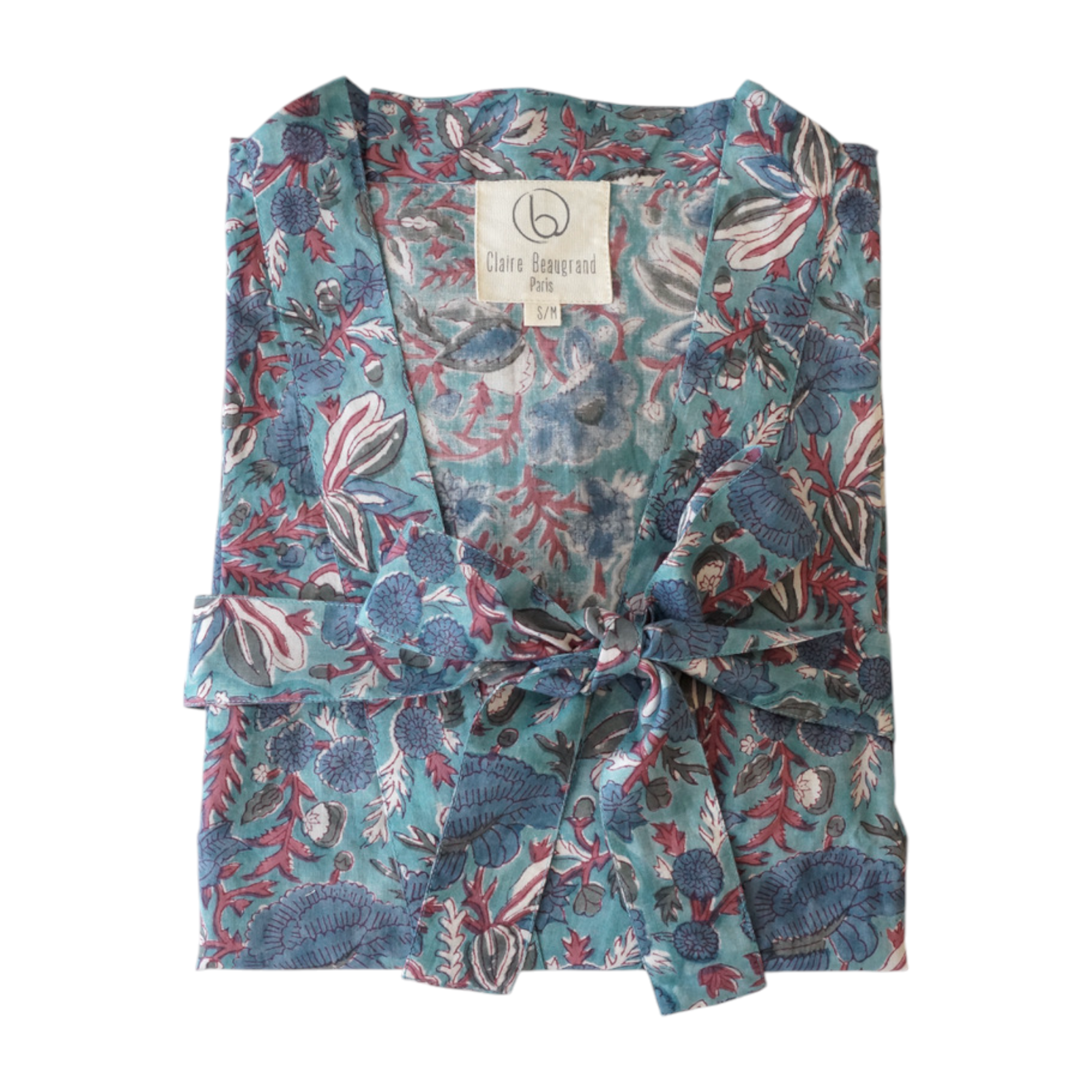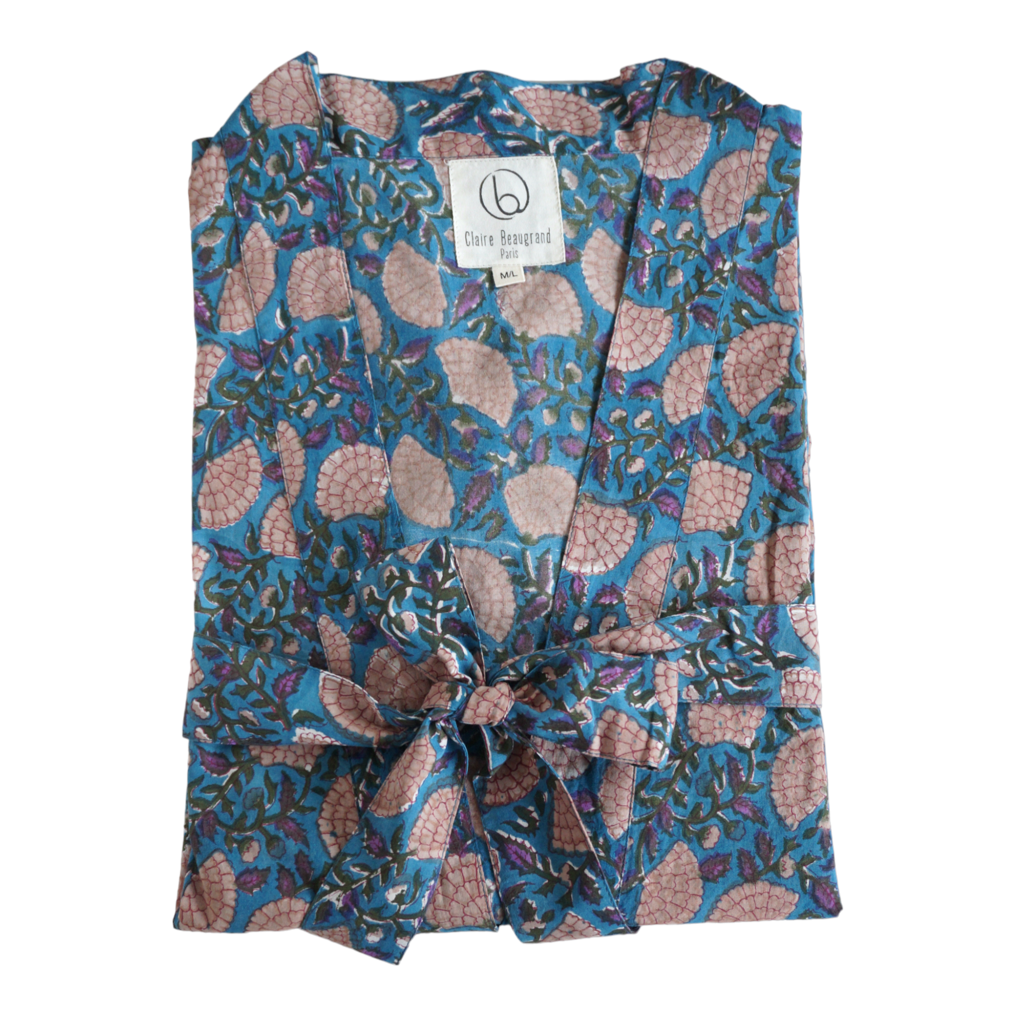 Kimono met bijpassende katoenen tas bedrukt met een houten blok, geïnspireerd op de oude Indiase kunst. Met lange mouwen met nette afwerking, opgestikte zakken en ceintuur. Een interne band zorgt voor een fijne aanpassing ter hoogte van de borst. Perfect om 's ochtends bij het ontbijt uit bed aan te trekken; deze kimono geeft je een kleurrijke start van de dag. Ook ideaal om op het strand te dragen, over een badpak of korte broek. Wij raden een koude was aan. Hoogte: 110 cm. Wordt geleverd met een stoffen tas van 28x34 cm, waardoor het een zeer verfijnd cadeau is. Beschikbaar in de maten S/M en M/L.