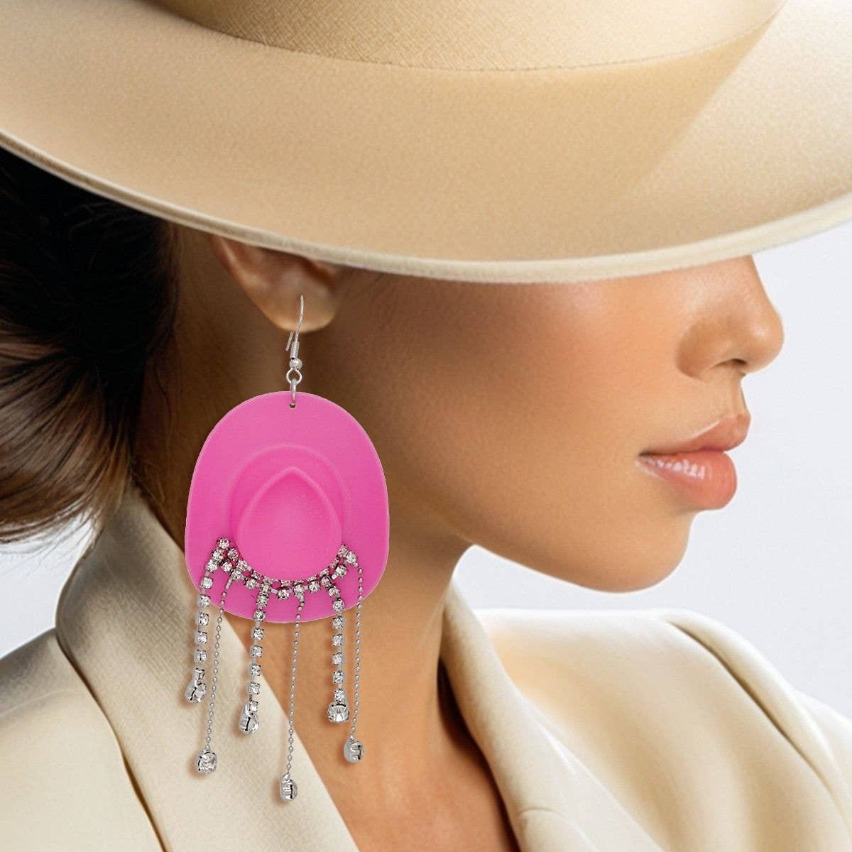 Vrouwen vishaak oorbellen. Lange zilveren metalen vishaak oorbellen met acryl witte cowgirl cowboyhoed met zilveren metalen en heldere strass franjes. Yeehaw!