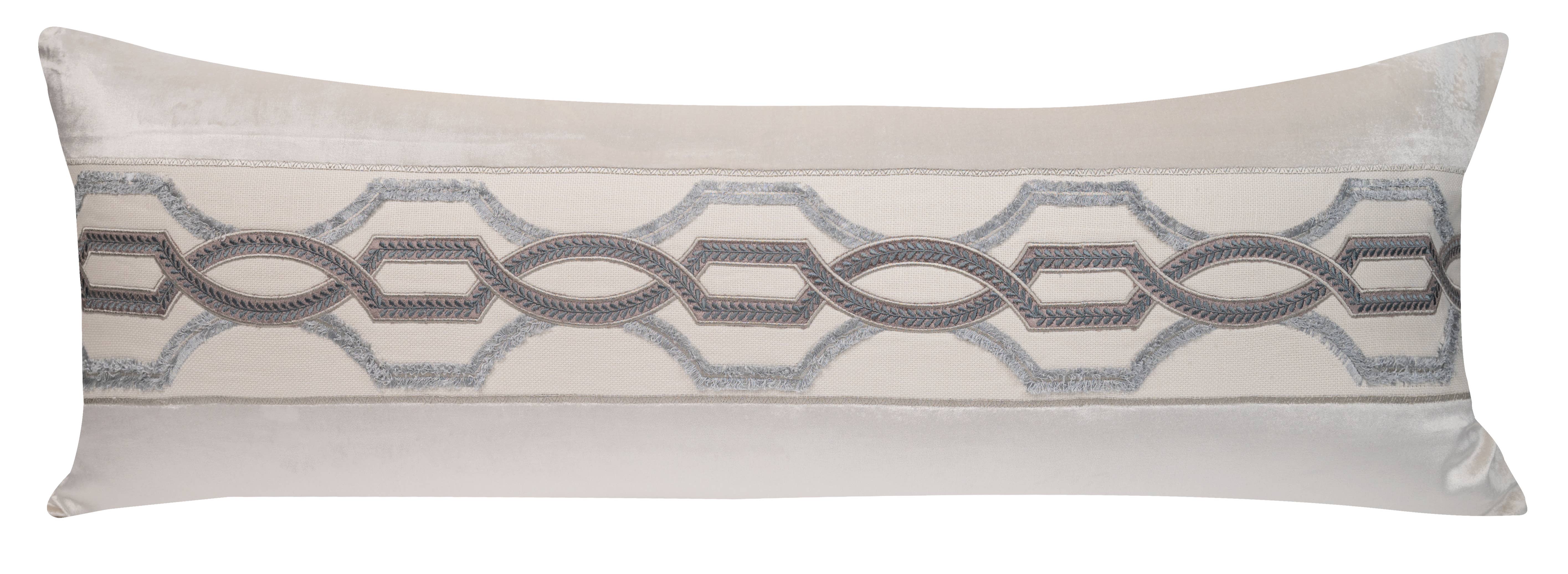 Decoratief fluwelen kussen van 22"WX22"L met geborduurde rand aan één kant dat omkeerbaar is naar effen fluweel. Het kussen heeft een mesrand met verborgen rits en bevat een vulling van 95/5 veren en dons.