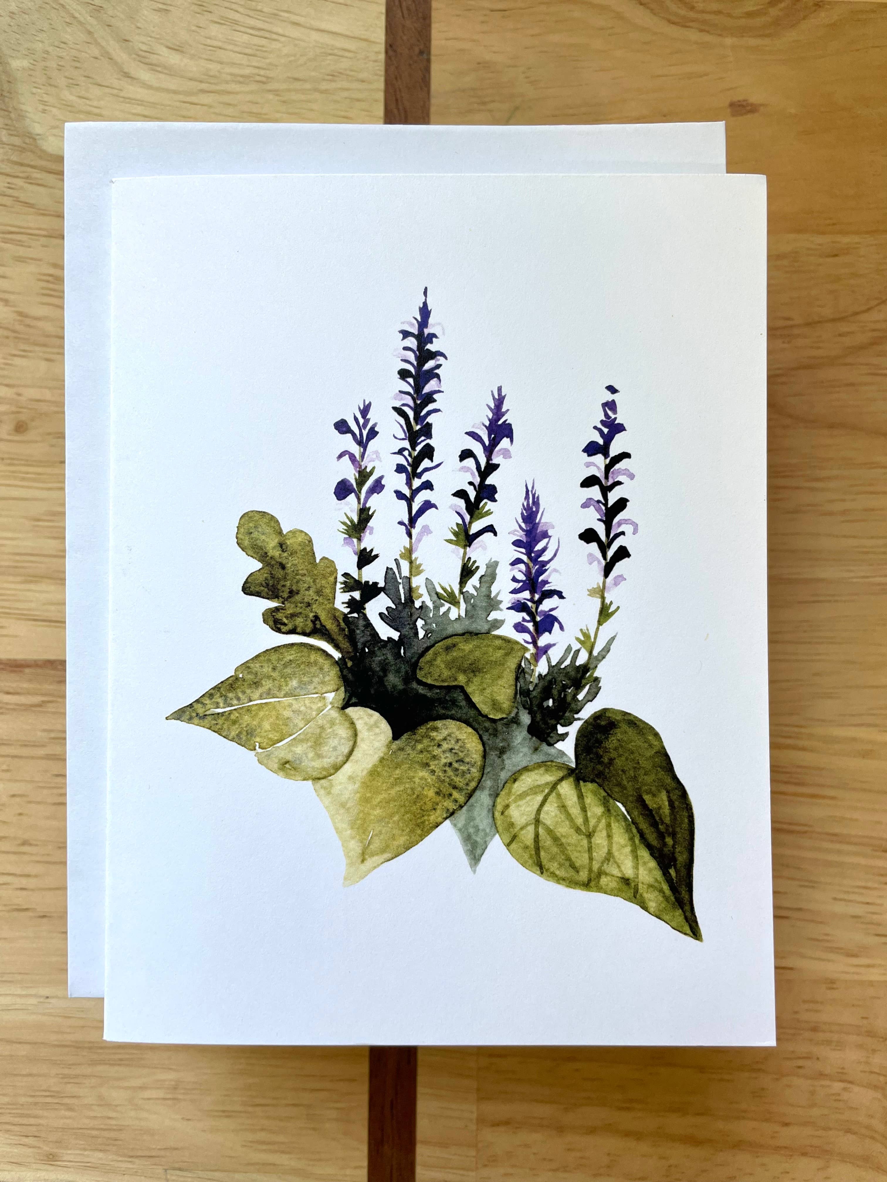 Wenskaart in A2-formaat op 100lb. stock, met een digitale versie van een origineel aquarelschilderij van Kristin Schmidt. Blanco van binnen. Inclusief een peel & stick-envelop en beschermende plastic hoes.