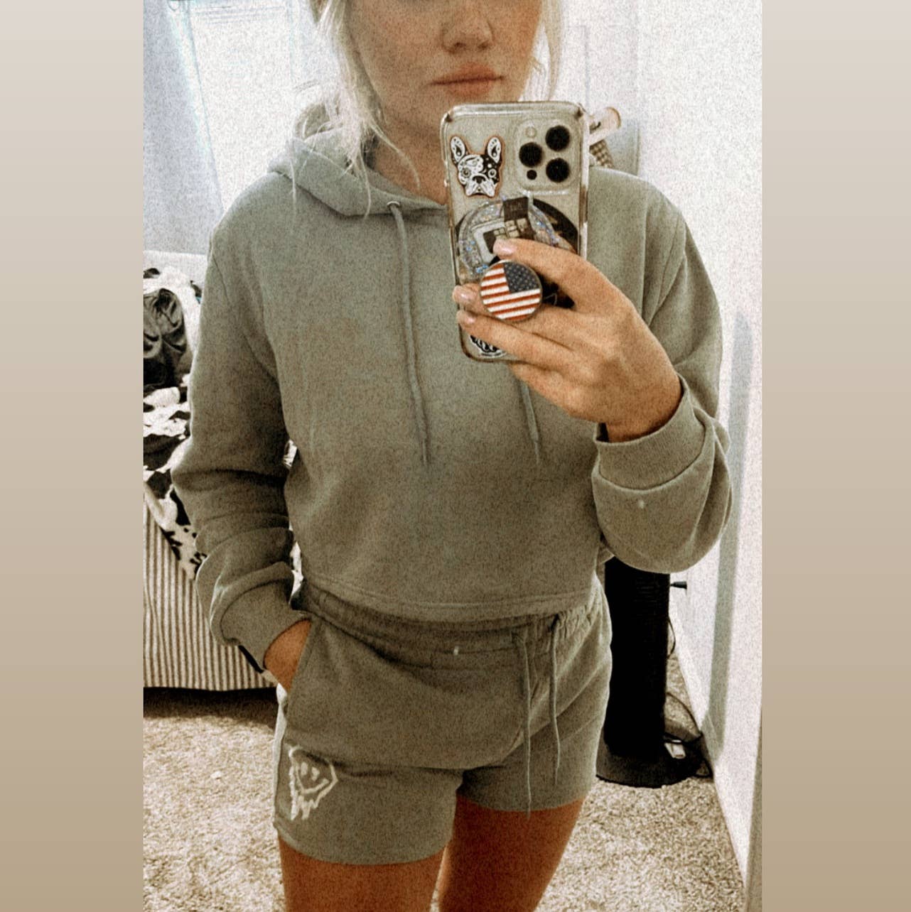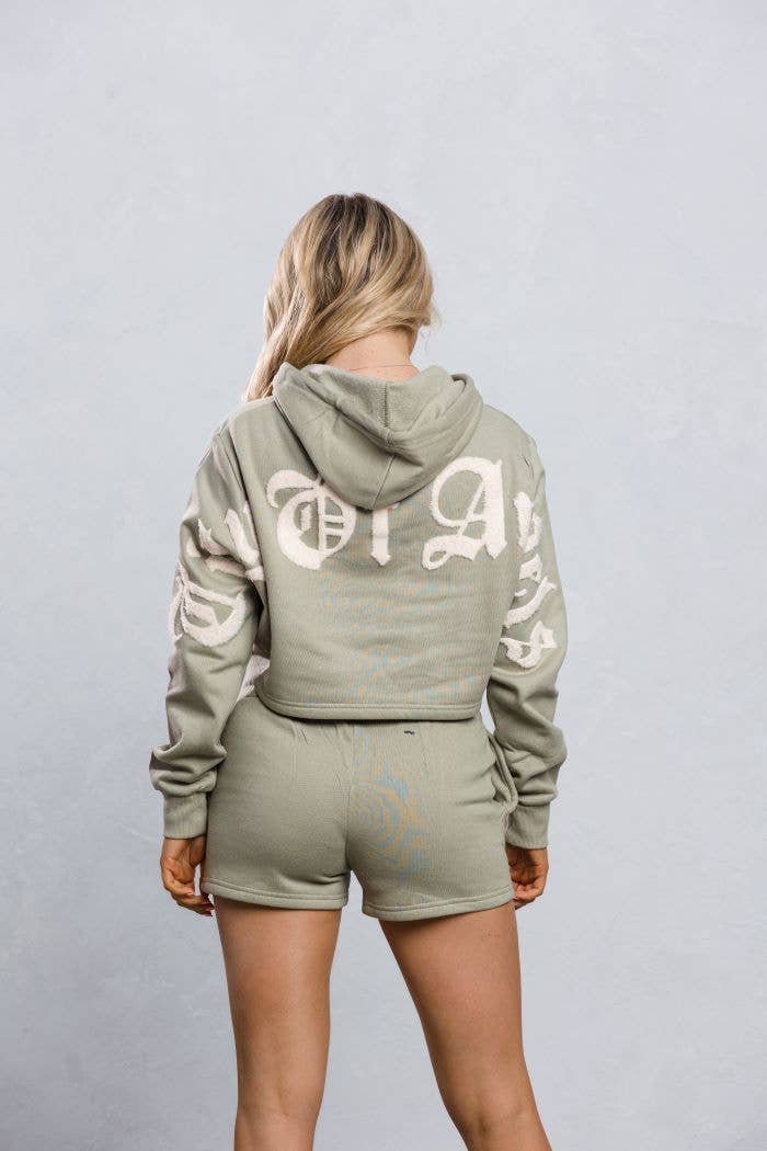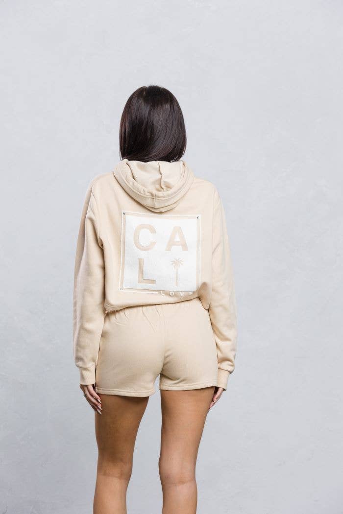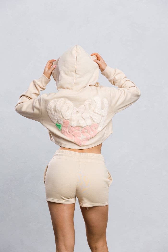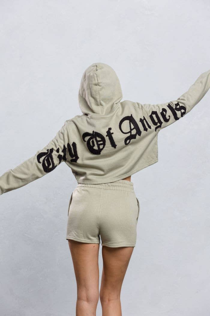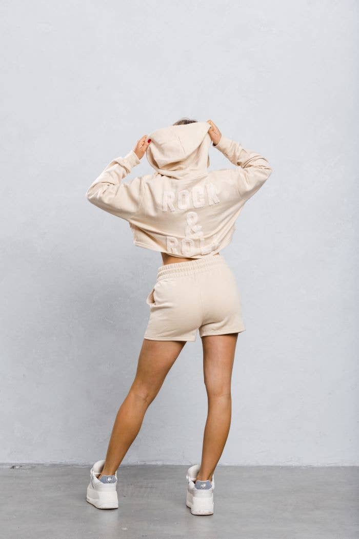 TWEEDELIGE SET MET CROP-HOODIE MET TREKKOORD EN MATZILVEREN RING. LANGE MOUWEN MET GERIBBELDE MANCHETTEN. DE MINISHORT IS VOORZIEN VAN EEN GERIBBELDE STRETCHBAND MET TREKKOORD AAN DE VOORKANT EN ZIJZAKKEN. (AFDRUK IS ZOALS GETOOND OP DE AFBEELDING) (WASVOORSCHRIFTEN: KOUD, DELICAAT OF VOORZICHTIG WASSEN. (ALLEEN OPHANGEN EN DROGEN.) ZELF: 60% KATOEN, 40% POLYESTER GEMAAKT IN VIETNAM
