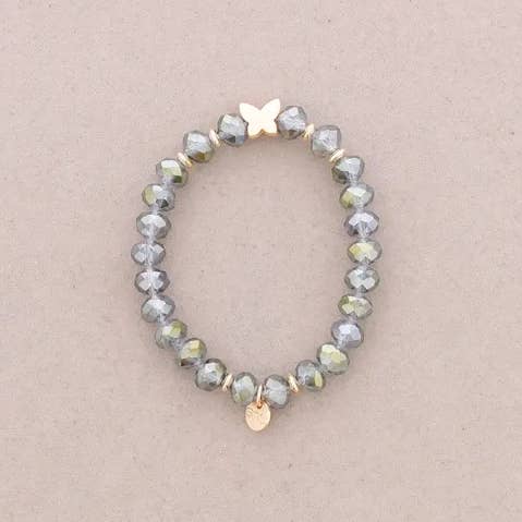 Elastische armband versierd met facetten van kristal en een metalen boomdecoratie.