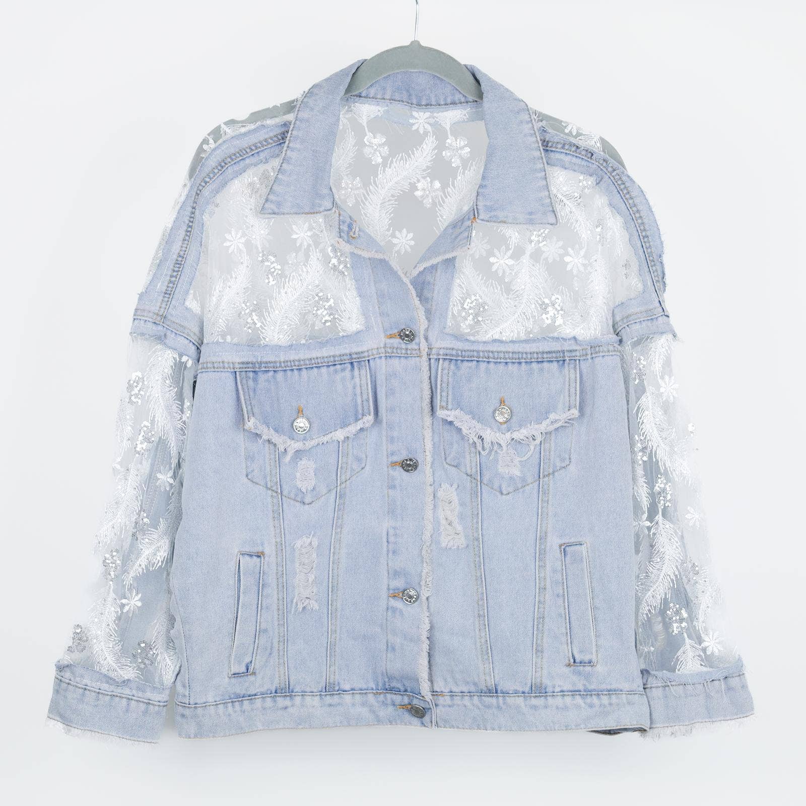 Verhoog je denimspel met dit verbluffende jasje! Dit lichtgewassen spijkerjasje is getransformeerd met ingewikkelde witte pailletten kantpanelen over de schouders, rug en volledige mouwen, wat een prachtig contrast en luxueuze textuur biedt. Versleten details overal voegen een stedelijke rand toe, waardoor het een echt uniek stuk is. Ideaal voor degenen die van unieke mode houden en willen opvallen. Eén maat, past UK 14-16.