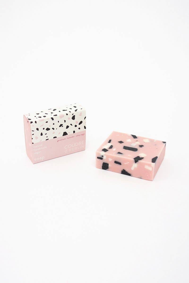 Onze zepen worden met de hand gemaakt in een kleine fabriek in het hart van Berlijn. Ze hebben een fijn terrazzo patroon. Voor de productie worden alleen geselecteerde plantaardige oliën, vetten en essentiële oliën gebruikt, die van nature reinigende, voedende en regenererende eigenschappen hebben. Onze geurende zepen zijn geschikt voor het wassen van lichaam en handen. De roze zeep heeft een frisse bloemige geur met lavendel-, geranium- en salieolie. De zepen zijn veganistisch en bevatten geen palmolie en geen ingrediënten op mineraaloliebasis. Sommige gebruikte ingrediënten zijn biologisch gecertificeerd. Een stuk zeep weegt 70 g.