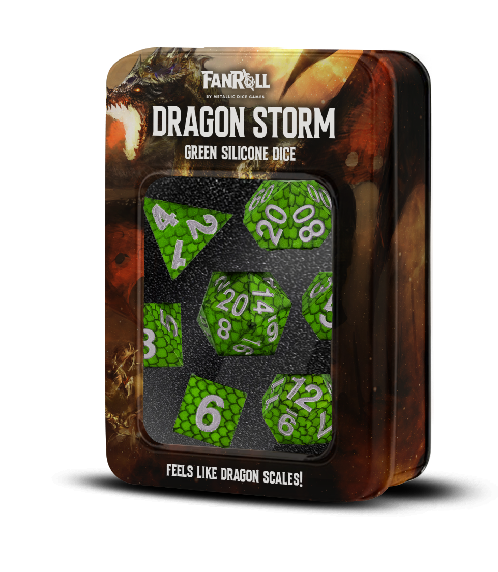Deze nieuwe reeks dobbelstenen is perfect voor elke tabletop-avonturier! Dragon Storm bevat dobbelstenen met daarin het hoofd van een draak, prachtig gevangen in elk van de zeven dobbelstenen van het set. Deze volledige sets bestaan uit 16 mm polyhedrale dobbelstenen en bevatten 7 dobbelstenen: d4, d6, d8, d10, d10% (00-90), d12 en d20.