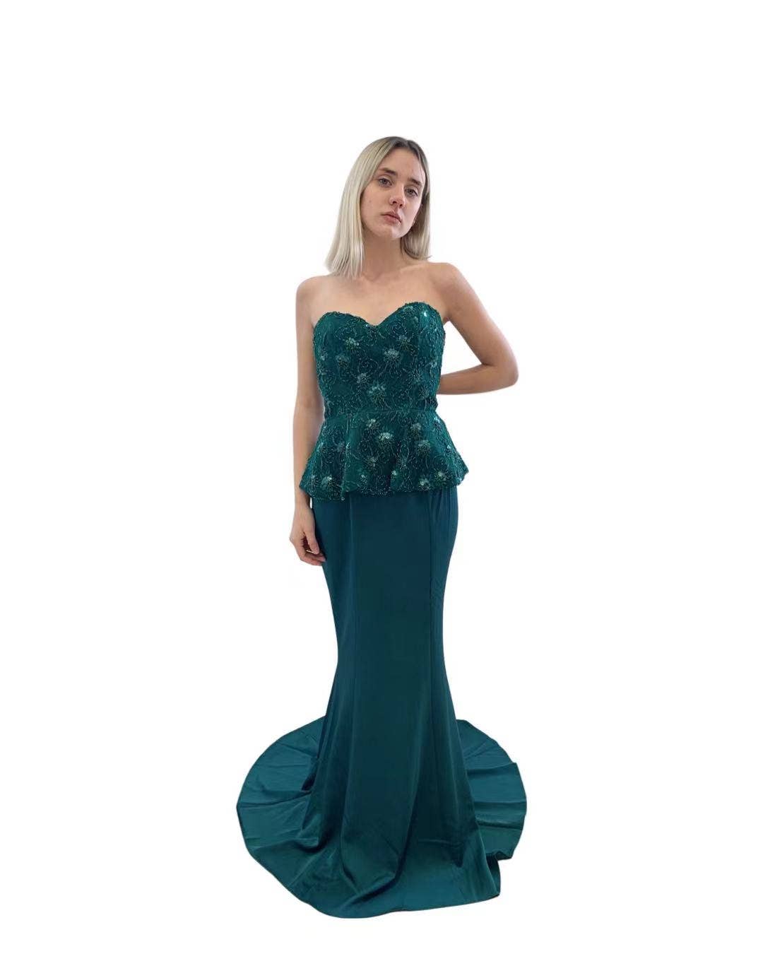 Lange jurk, ideaal voor bruiloften, evenementen, cocktails en allerlei feestelijkheden. Strapless met een diagonale ruches waardoor de jurk extra glamour en elegantie krijgt.