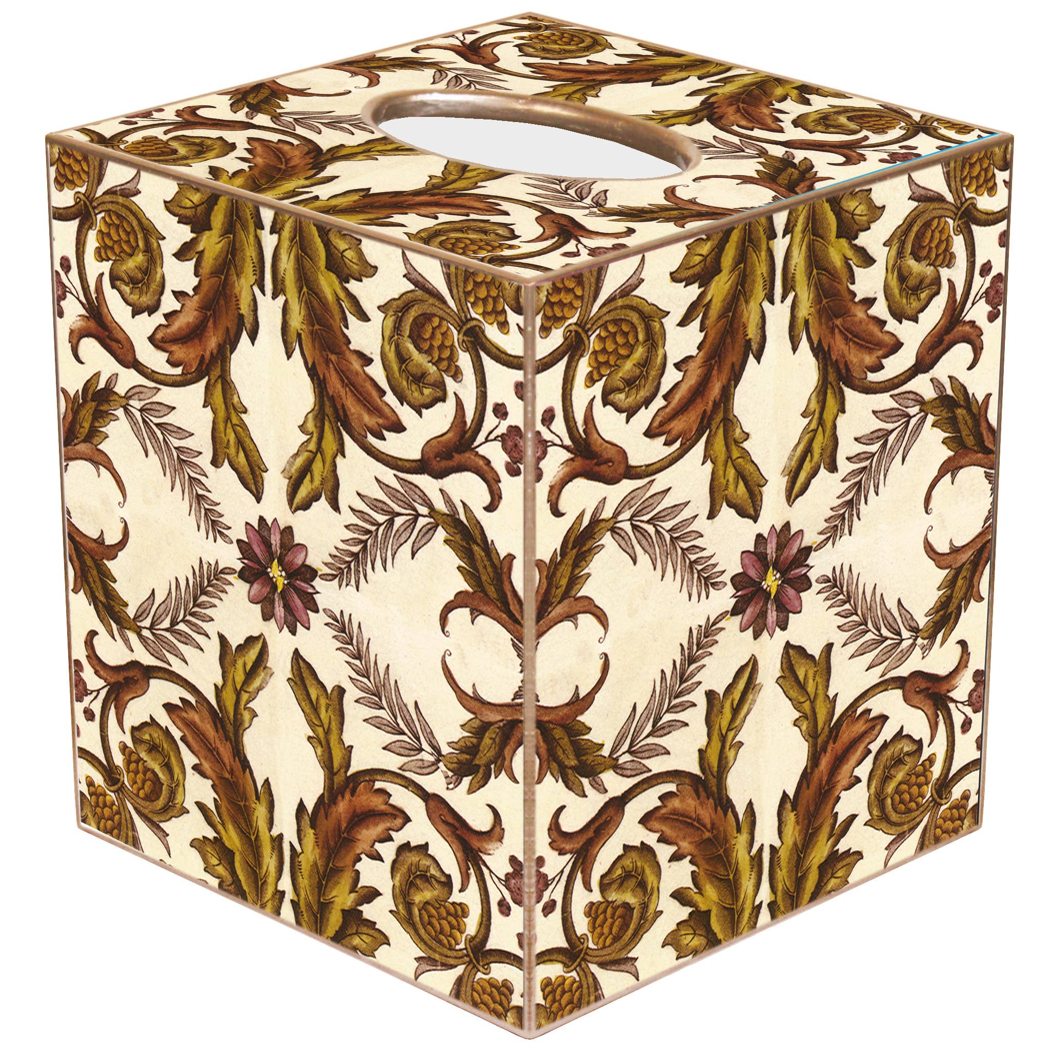 Onze decoupage-tissuedooshoezen worden op bestelling met de hand gemaakt door ons geweldige team in Houston, TX. Ze glijden gemakkelijk over elke hoes van een in blokjes gesneden tissuedoos. Het kunstwerk is met de hand gesneden, ontkoppeld en gepolijst. De hoes van elke tissuedoos is aan de randen met de hand beschilderd in goud of zilver om het helemaal af te maken. We bieden 3 materialen voor de tissuedooshoezen: 1. Papier Mache: $19 Afmetingen: 5,5 „H x 5" B x 5" L 2. Hout: $30 Afmetingen: 5,25 „H X 5" B X 5" L 3. Blikje: $30 Afmetingen: 5,75 „H x 5,125 „B x 5,125” L