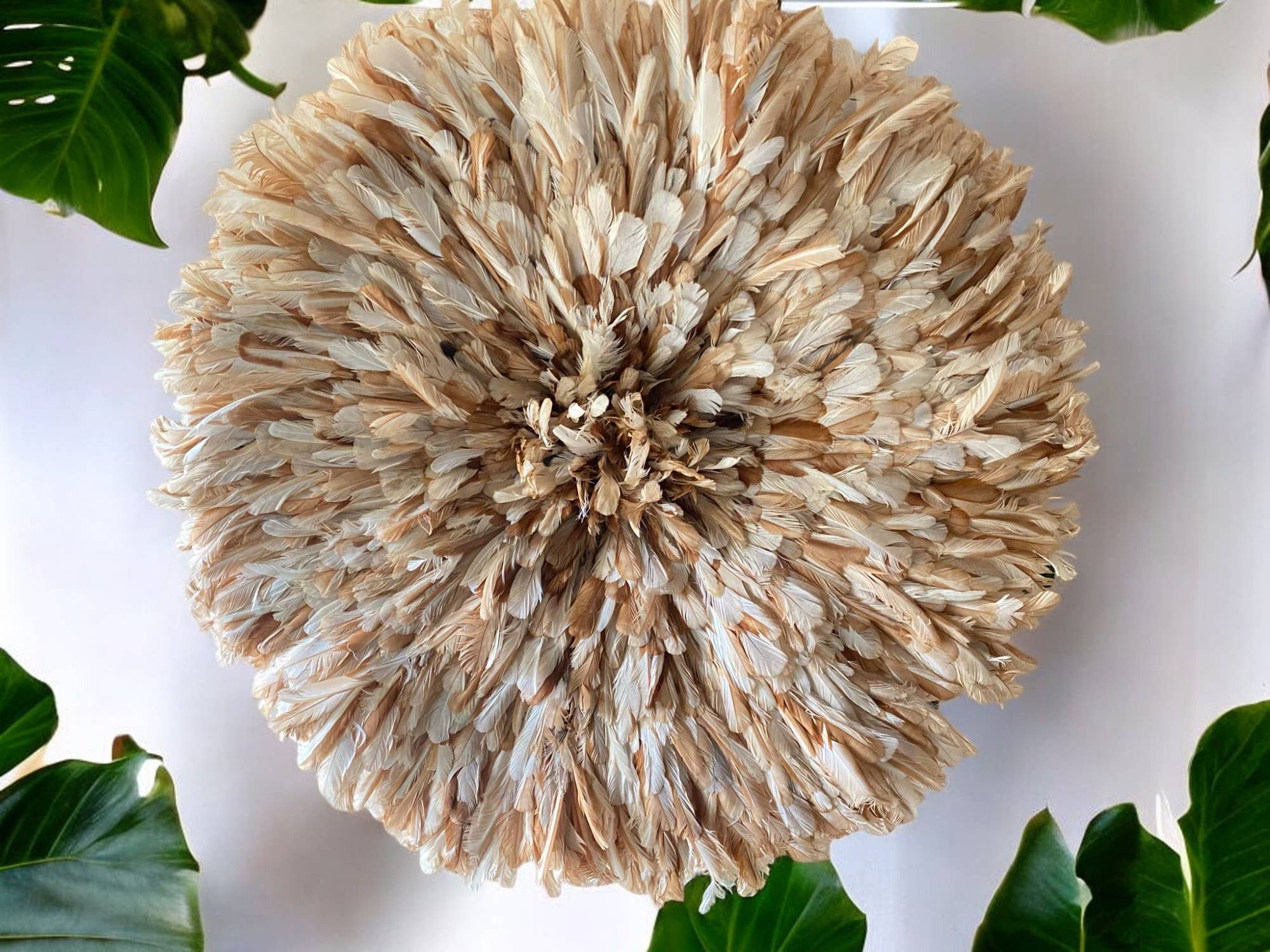 Trio Juju-hoed set/Perzikkleurige juju-hoed/Juju-hoed met spikkels Afmetingen: 60 cm (24 inch), 50 cm (16 inch), 30 cm (12 inch) Gemaakt van natuurlijke witte of ivoren veren en bruine of beige veren die zorgvuldig op de raffia-basis zijn genaaid. Dit prachtige juju-hoedje is volledig handgemaakt in Kameroen, Afrika. Gemaakt met groot vakmanschap op basis van natuurlijke veren, raffiastokjes en doeken. Het ambacht wordt geërfd van onze voorouders en van generatie op generatie doorgegeven. Juju-hoeden worden verondersteld de grote eigenschappen van vogels en welvaart te bezitten. Juju-hoeden zijn veel verder gegaan dan Kameroen, Afrika en zijn te vinden op de muren van luxe tophotels, scholen, huizen, en meer! Binnenhuisarchitecten wenden zich tot het gebruik van Juju-hoeden in hun projecten en brengen het unieke karakter ervan aan het licht. Neem voor vragen rechtstreeks contact met ons op via de contactpagina van de website of ons Whatsapp-nummer hieronder.