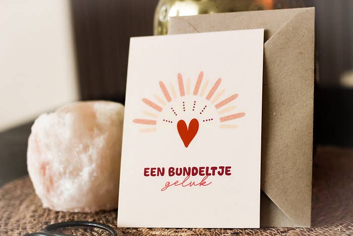 • A2 wenskaart (12,1 cm x 14 cm) • gedrukt op fijn 100# papier • gemaakt in de VS • crèmekleurige envelop • wordt verpakt in een cellofaanhoesje Tekst: "Dat is een geluksvogel van een baby. // Duizendmaal gefeliciteerd!"