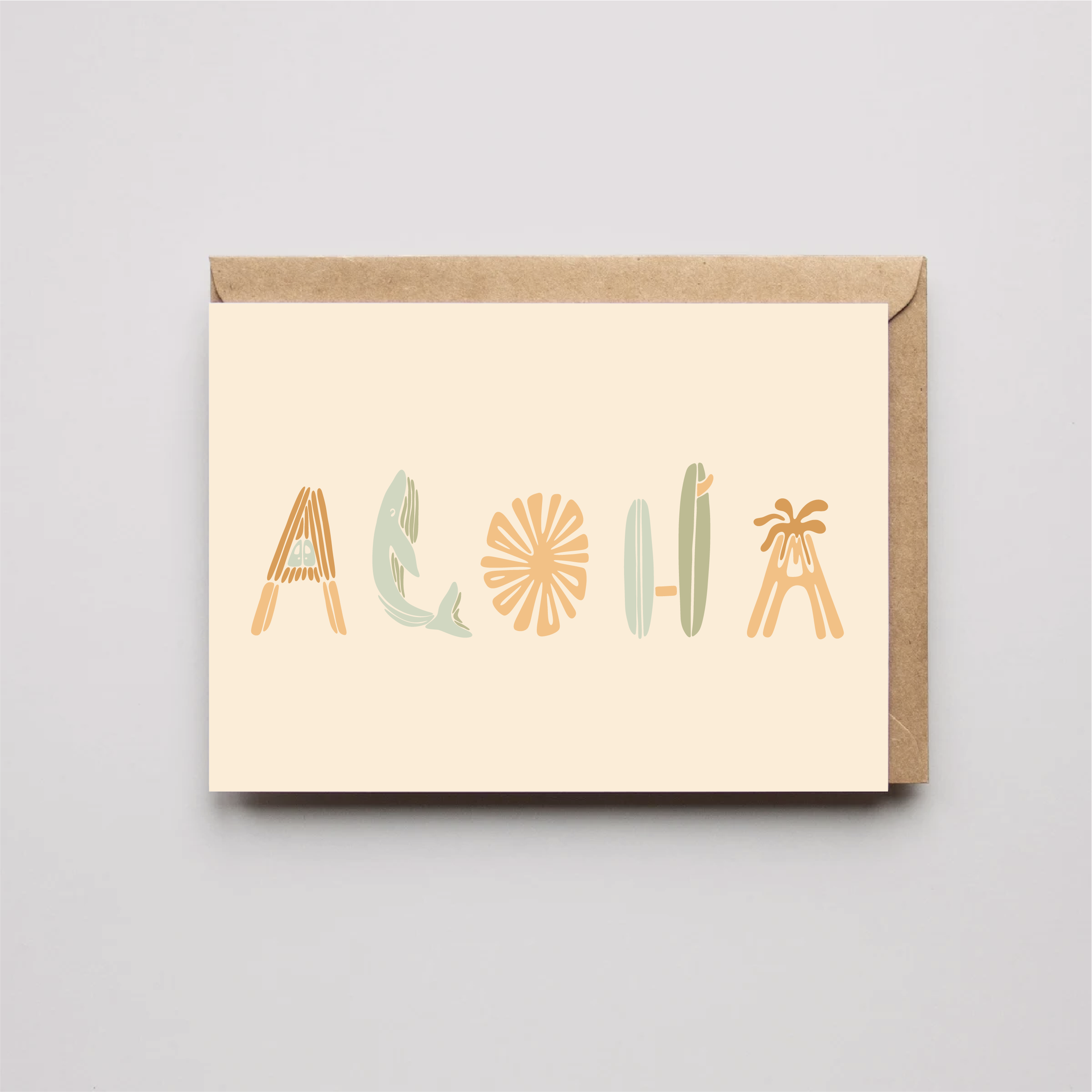 „Mahalo” wenskaart in de iconische Sarcreate Aloha Shapes. - Gevouwen kaart van 4,25 x 5,5 inch, matte afwerking - Blanco van binnen - Inclusief een envelop van natuurlijk kraft - Wordt geleverd in een verzegelde plastic hoes ter bescherming