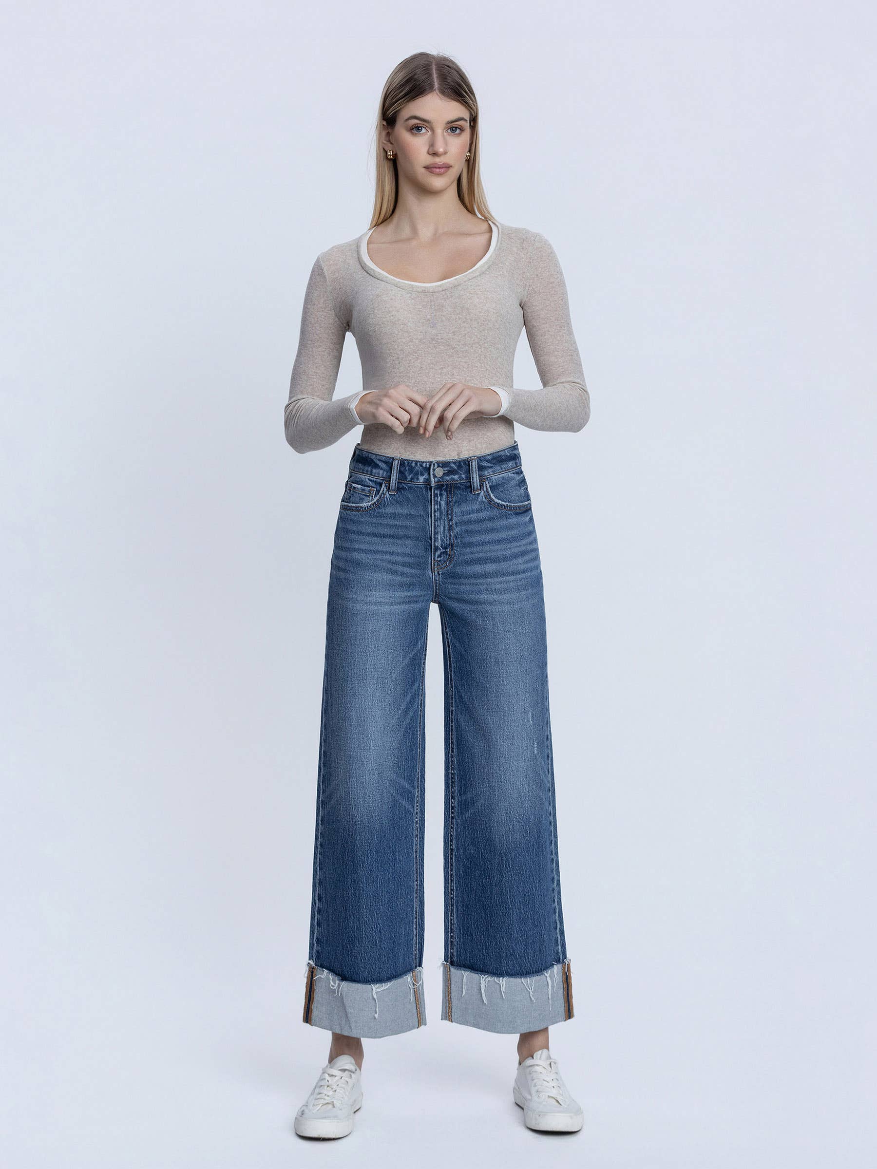 High waist losse wijde jeans met dubbele omslag V3589
