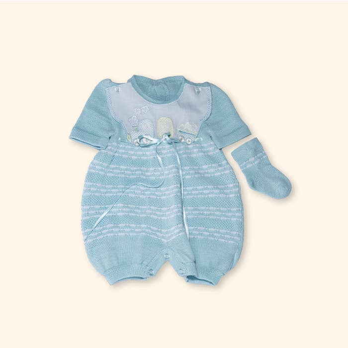 Uw kleintje zal het warm en comfortabel hebben in deze gebreide set van 100% katoen met lange mouwen in de kleuren blauw en ivoor. De set bestaat uit een bovenstuk, broekje, mutsje, wantjes en een deken.