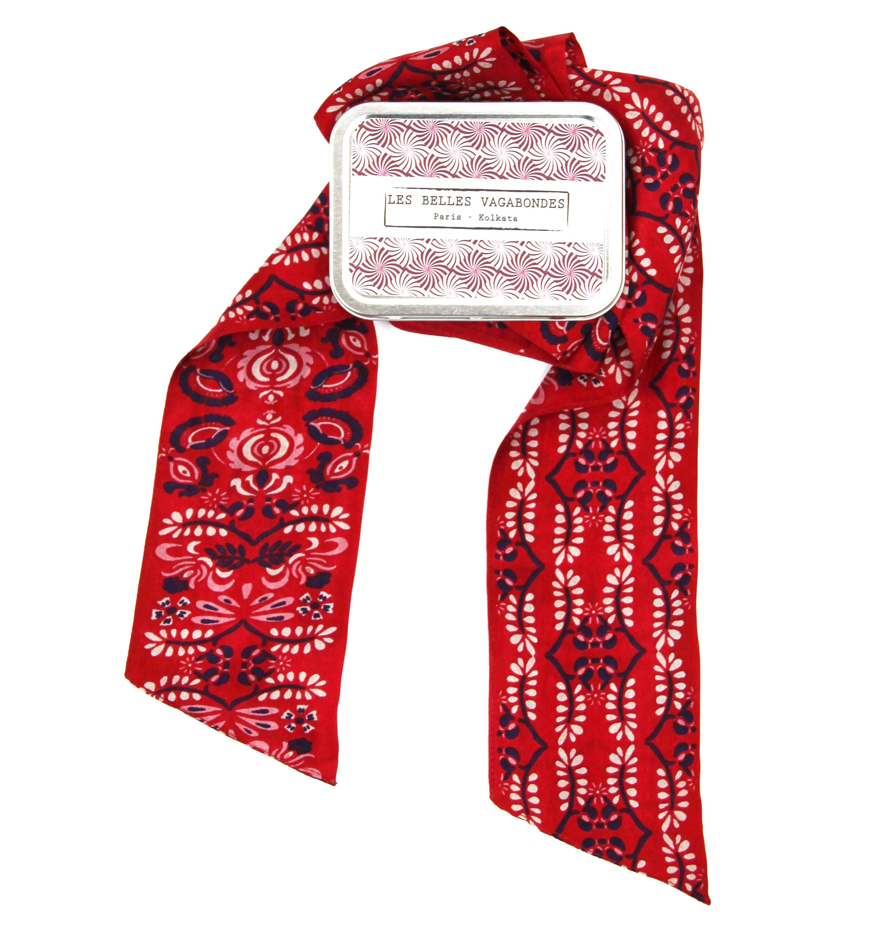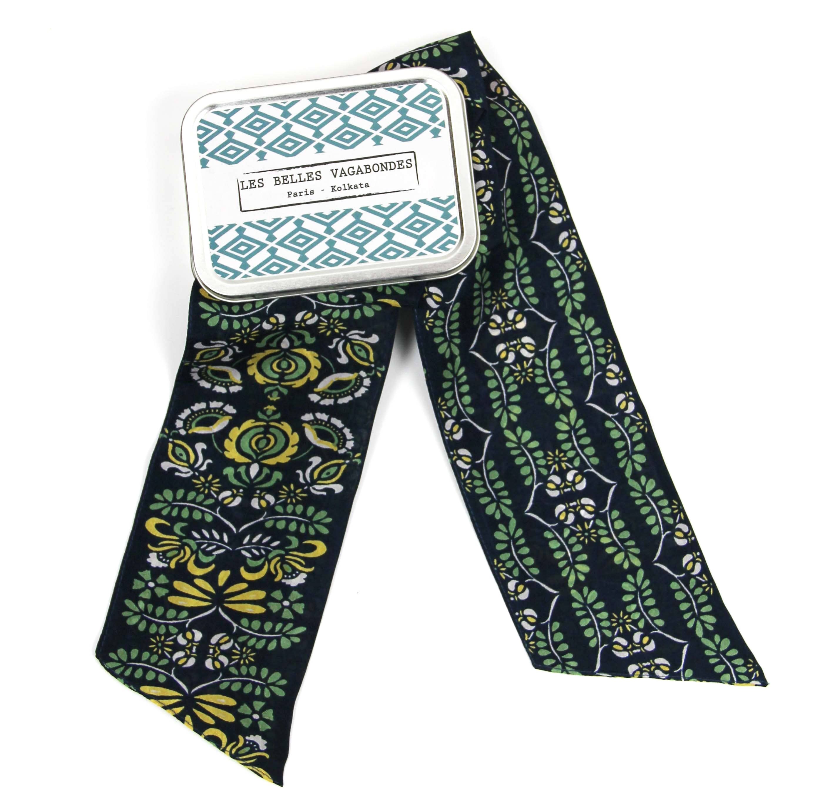 De SLASH-hoofdbanden Onze hoofdbanden zijn gemaakt van zijde, ze zijn een essentieel modeaccessoire om je outfits compleet te maken met een vleugje kleur en originaliteit. Ze kunnen als knotje of hoofdband/als lavallier/als riem/om de hals/om de pols/op een hoed/op een tas worden gedragen... Verkocht in een ijzeren doos met een strak en herbruikbaar ontwerp, zijn Slash-hoofdbanden een ongebruikelijk cadeau. 100% zijde 8 x 150 cm Met de hand getekend in Frankrijk Met de hand gedrukt in India