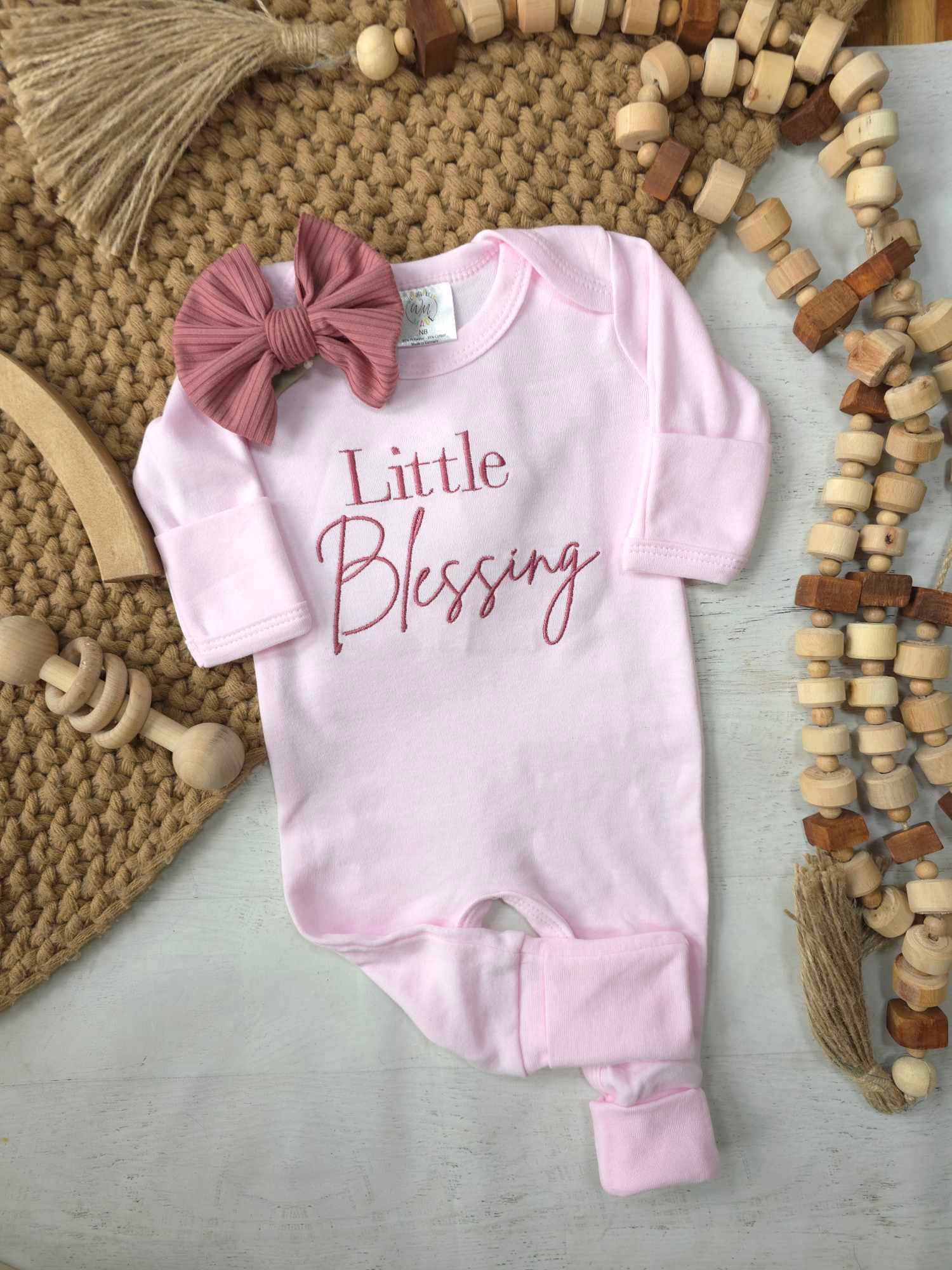 Deze volledig neutrale set is perfect als je nog niet weet wat het wordt of als je van een genderneutrale stijl houdt. De set bevat een ultra zachte romper in havermoutkleur, en je kunt kiezen voor een handgemaakte tulband of handgeknoopt strikje in bijpassend blush roze. Dit pakje is ideaal als thuiskom outfit, voor pasfoto’s of als kraamcadeau. De maat Newborn past ongeveer bij 2,7-4,1 kg. De maat 0/3 past ongeveer bij 4,1-5,9 kg. Alle geborduurde items hebben een zachte mesh voering aan de binnenkant om het stiksel te beschermen en irritatie te voorkomen. Gemaakt in een rookvrije en huisdiervrije omgeving. Productietijd: 1-2 weken.