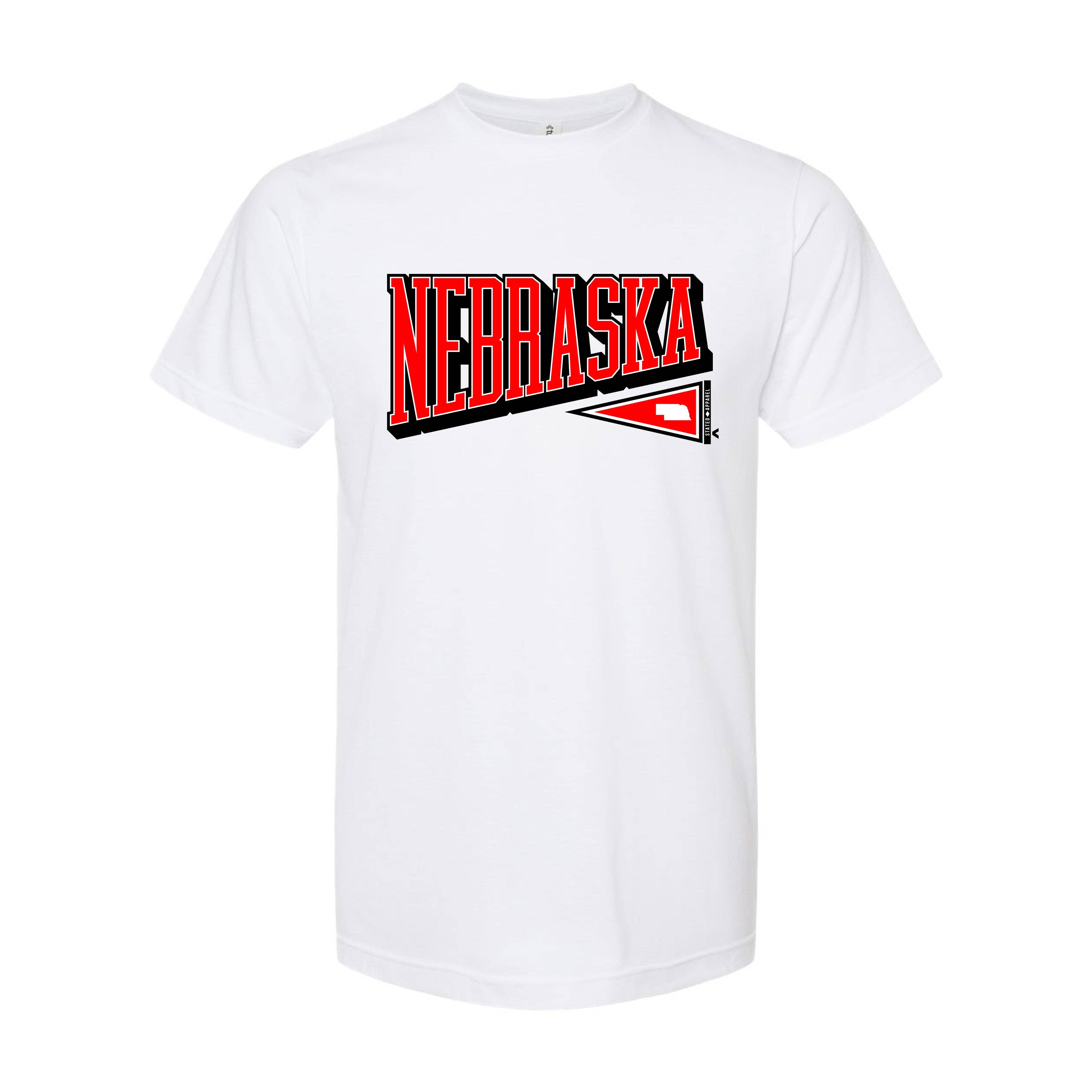 Staat Nebraska met T-shirt voor wandelende dieren. Heatherrood uniseks T-shirt met witte afbeeldingen. Verkrijgbaar in de S-3XL. Dit ontwerp is gemaakt op ons premium zachte T-shirt. -4,3 oz., 50/50 katoen/poly.