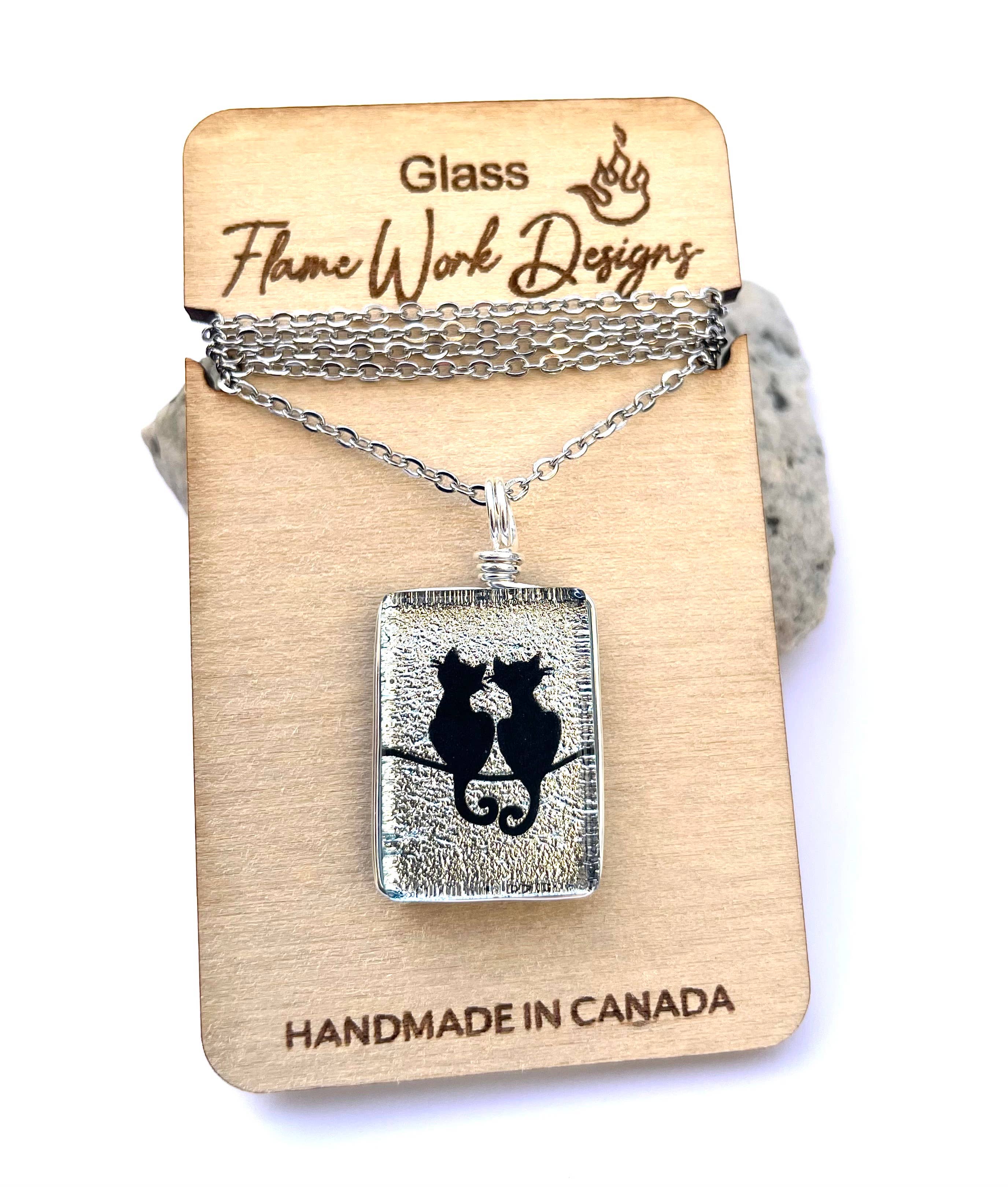 Dichroïsche glazen hanger 'Sitka'. Dit populaire boomontwerp is geëtst op dichroïsch glas van originele kunstwerken, exclusief voor Flame Work Designs. Deze unieke Dichroic-hanger is zorgvuldig met de hand gemaakt door de bekwame kunstenaars Carolyn & Anthony Green, die in Victoria, BC Canada wonen. Elk kunstwerk is van begin tot eind zorgvuldig ontworpen en gemaakt met alleen de beste vaardigheden op het gebied van glasvakmanschap. Gesmolten glas is een proces waarbij glaslagen aan elkaar worden gesmolten in een oven bij temperaturen tussen 1350-1450 graden Fahrenheit. Als het glas na 10-12 uur is afgekoeld, slijpen we het glas vervolgens met een diamantbit om het stuk vorm te geven. Daarna wordt het glas vervolgens vuurgepolijst en uitgegloeid in de oven om het glas glad, glanzend en duurzaam te maken. Elk stuk glas wordt 2 tot 3 keer in de oven gebakken voordat het klaar is om er prachtige sieraden van te maken. De hanger wordt geleverd op een roestvrijstalen ketting van 18 inch op een op maat gemaakte berkenhouten displaykaart.