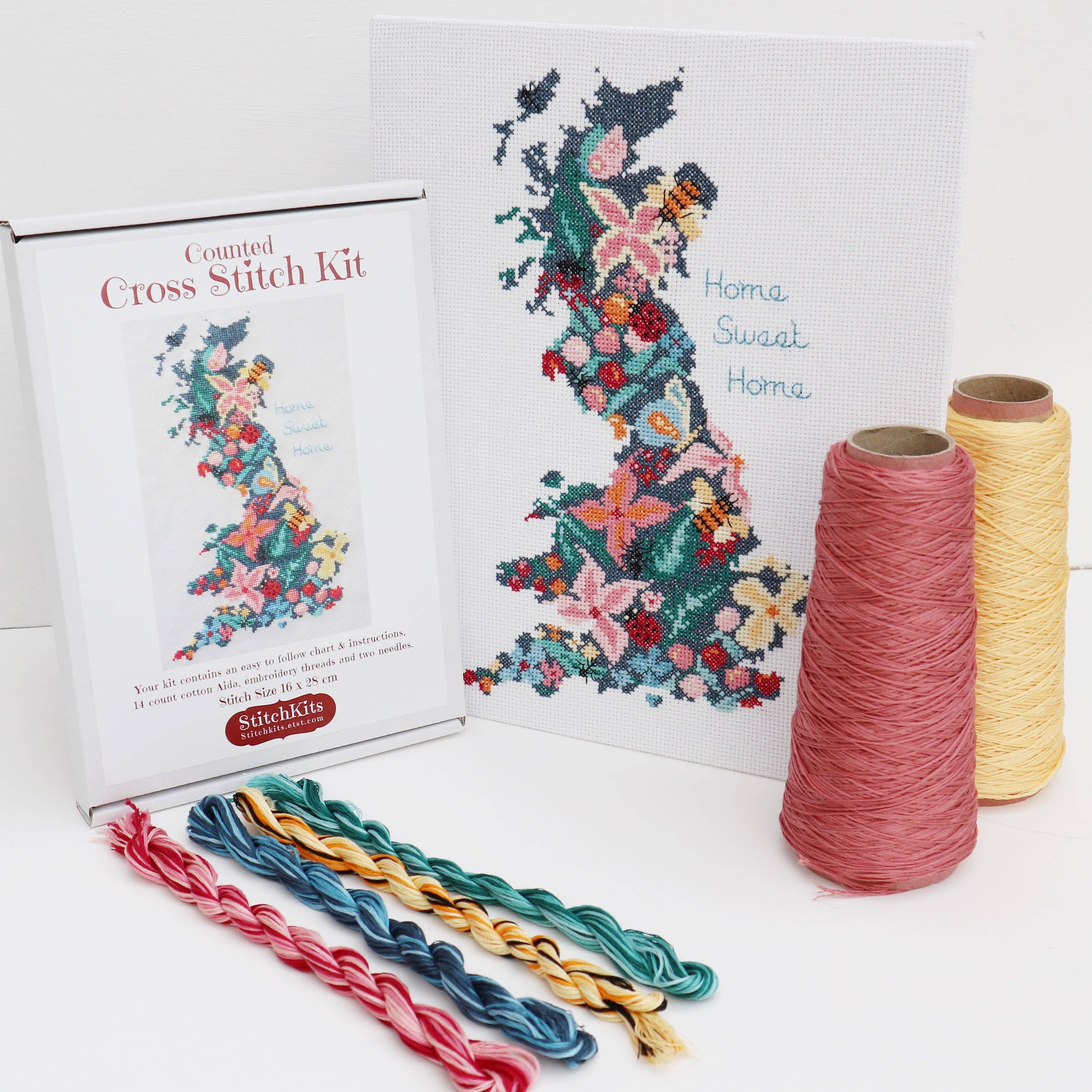 Deze opvallende kruissteekset is een mooi cadeau, als set of genaaid in deze schattige Embroidery Hoop wandhanger. Dit moderne, 'Love' kruissteekontwerp is voorzien van kleurrijke snoeproze of Ocean Blues. De set wordt geleverd met een prachtig met de hand afgewerkte borduurring van 5 inch bedekt met Liberty of London-stof en een houten achterkant zodat het voltooide project er van alle kanten prachtig uitziet. Inbegrepen in de kit is: Een stapsgewijze 'How to Cross Stitch Guide' Een stukje katoen aida om op te naaien DMC katoenen borduurgaren in vier kleuren een naald instructies voor de afwerking een decoratief borduurraam van 5 inch en een houten schijf om de achterkant van je werk te bedekken.
