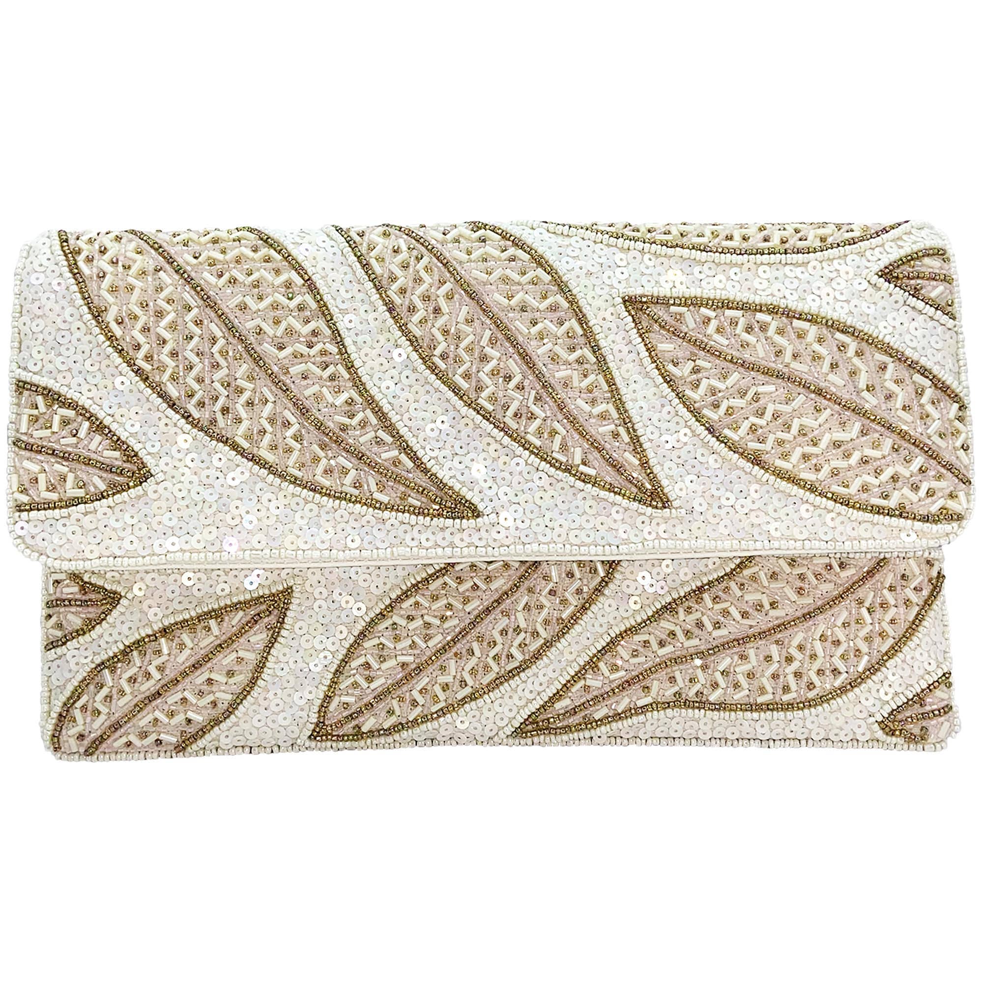 De Abstracte Tonale Kralen Clutch is een verfijnd en elegant accessoire dat een prachtige mix van champagne- en ivoorkleuren heeft. Het ontwerp is subtiel bruidsachtig, met parels, pailletten en kralen in verschillende vormen die een rijk, getextureerd patroon creëren dat ingetogen luxe uitstraalt. Deze clutch heeft een verfijnde, tijdloze kwaliteit, waardoor hij geschikt is voor bruiloften of speciale gelegenheden zonder overdreven bruidsachtig te zijn. De achterkant van de clutch heeft een delicate glans, wat een extra laag van elegantie toevoegt, terwijl de binnenkant is gevoerd met witte stof voor een schone, klassieke afwerking. Met afmetingen van 9 x 6,5 inch biedt deze clutch de perfecte grootte voor avondgelegenheden, formele gelegenheden of elke keer dat een chique en gepolijste uitstraling gewenst is.