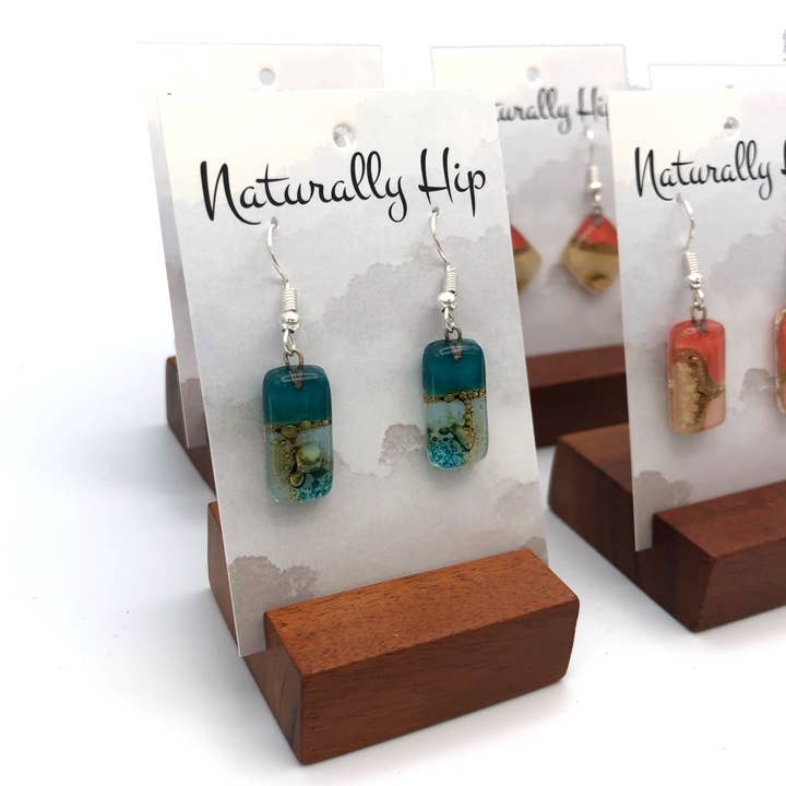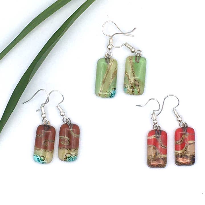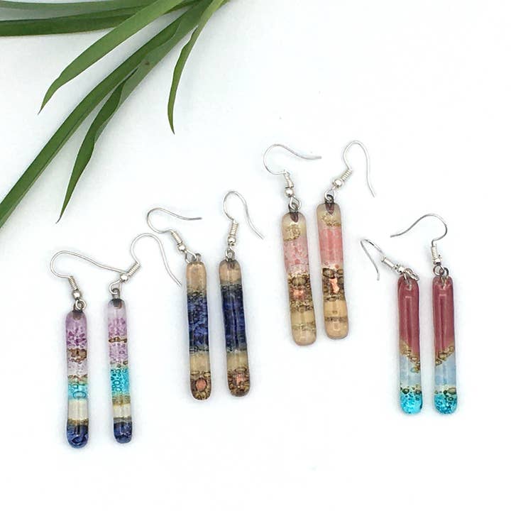 These beautiful fused glass earrings are created from upcycled single windowpane glass by a women's collective in Ecuador. Mixed colors and shapes -- each pair is unique! This 18-unit assortment includes a balanced selection of our various shapes and colors of our small-sized earrings. Earwires are made of surgical stainless steel. Fair trade.