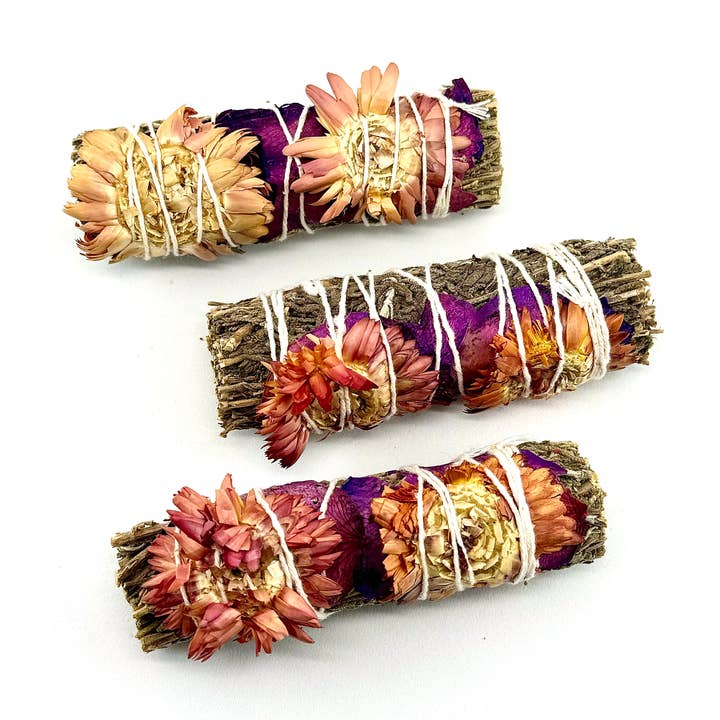 White Sage, Lavender & Eucalyptus Dollar Sage A powerful mix of White Sage + Lavender + Eucalyptus Florals creates an aroma to cleanse negativity and hate. Bring wealth, health, prosperity, healing and coolness to your life. White Sage is used to 'wash off' the outside world when one enters ceremony or other sacred space. FLORAL colors may vary. SIZE: 4" - 5" QTY: 12 Sticks Intentions: White Sage: to protect, purify, + remove negative energy All of our Sage is sustainably grown on private land and very carefully collected to preserve these sacred plants 🌿 Liv Rocks Sage is sustainably grown on private land and very carefully collected to preserve these sacred plants. ✨ Get rid of negative energy, neutralize a space for meditation or tarot session, or dispel bad vibes in your home with our beautiful sage products