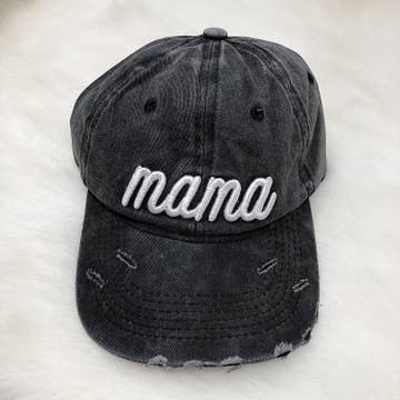Neutral dark gray distressed base ball cap with white embroidery on the front. Feautures a curved bill and finished with an adjustable strap at the back. This hat is perfect for summer! Dimensions: - Head circumference: 20 inches with 5 inch adjustable strap - Bill: 3 inches long - Cap Height: 6 inches - "Mama" embroidery is 4 x 1 inches 100% cotton Made in China