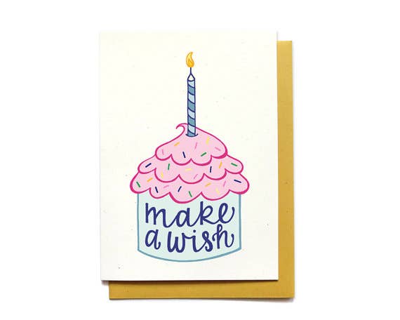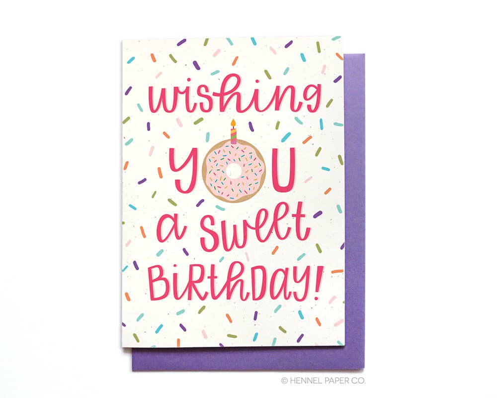 FRONT: Wishing you a sweet Birthday! INSIDE: blank DETAILS: • Dimensions - one 5x7 folded card • Paper - 100# natural cardstock, 100% recycled • Envelope - purple recycled envelope (A7) • Packaging - sealed in a clear sleeve