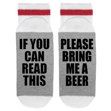 If You Can Read This - Please Bring Me A Beer Lumberjack Socks Our funny lumberjack socks are made using high quality materials that will last for years. With the words placed on the bottom of these socks, they are perfect for putting your feet up and creating a good laugh. Instant purchase for any occasion. Men socks size 10-13 Polyester/cotton/spandex/vinyl Ribbed stretch with stripe accent Mid-calf height
