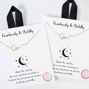 Don't Tell Me The Sky Is The Limit When There Are Footprints On The Moon Heart and Crystal 18" Necklace. This decorative necklace comes on a stainless steel chain and 18 inches. Each necklace includes a crystal accent bead in white and an accent heart. Our charms are 100% hand made with American pewter.