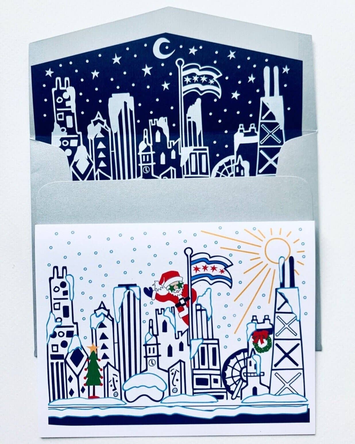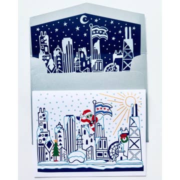 if you've ever ridden the cta trains, this card may look familiar. our chicago train lines & signage have beautiful bold colors, a familiar helvetica font & cute, little directional arrows. this card is inspired by my sweet home chicago! pack/6 A2 5.5" x 4.25" 2 color letterpress printed bright white cover stock bright blue envelope blank inside