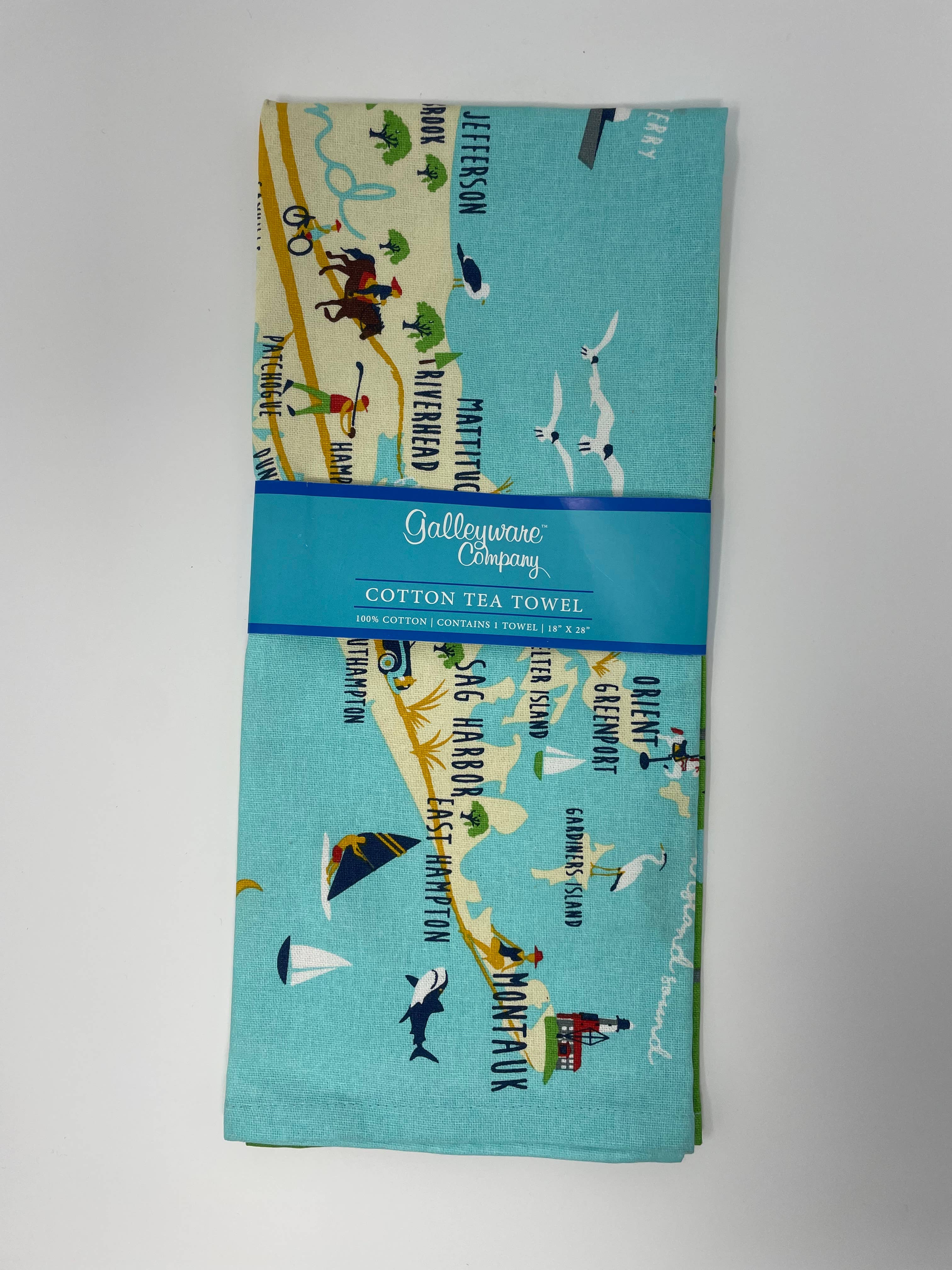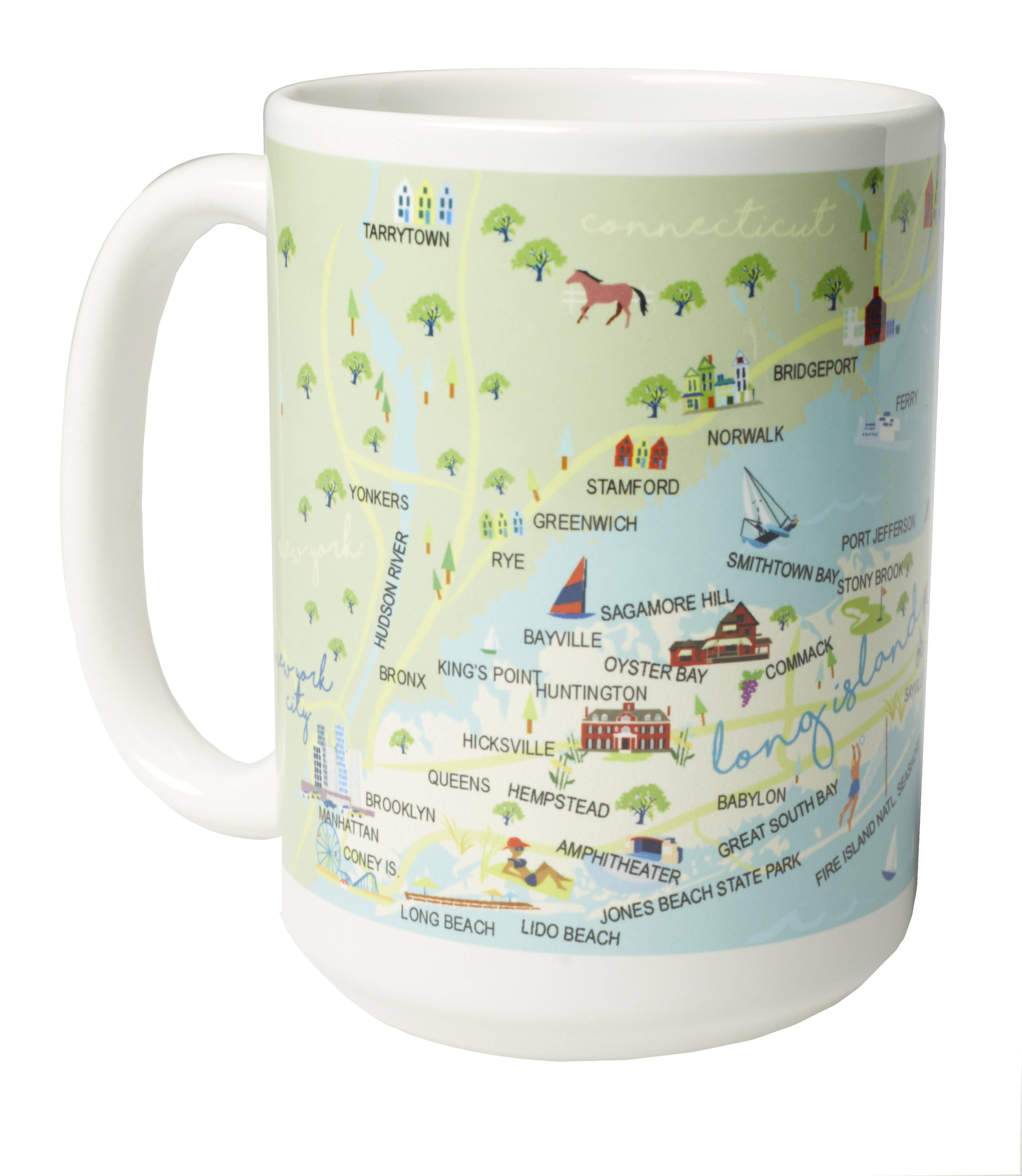A whimsical depiction of Long Island, highlighting notable towns and tourist attractions on a vibrant 16" oval melamine platter. Not for use in the microwave. Scratch and break-resistant. Dishwasher-safe.