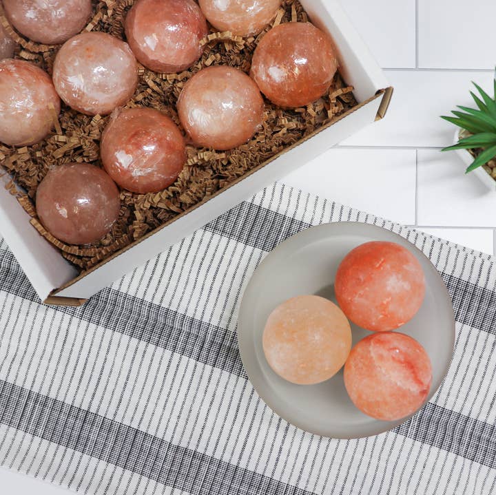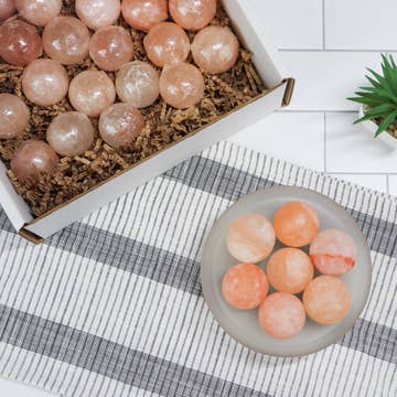 Himalayan Salt Massage Ball set by Himalayan Secrets© - the perfect way to indulge in a soothing and rejuvenating massage experience! Crafted from 100% natural Himalayan salt, these massage balls offer an array of health benefits, including reducing muscle tension and promoting healthy blood circulation. The massage balls can be easily warmed up in a microwave for 30 seconds, or on a skillet set on low heat. But, to ensure perfection, use one of our Warming Bowls (part #HSSL-MSW) with a 40-Watt bulb that warms the massage stones, and doubles as a decorative lamp. Their unique shape provides a comfortable grip and allows for easy maneuverability, making them the perfect choice for a relaxing massage session. Care: Wipe to clean. Do not rinse. Disclaimer: Please use with care and caution if you have sensitive skin. Comes in a corrugated box with crinkle paper. All stones are shrink-wrapped to avoid contact with moisture.