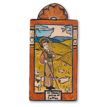 St. Drogo Retablo Patron Saint of Coffee and Baristas, Unattractive People & Bodily Ills Drogo was a Flemish nobleman born in 1186. He was orphaned in his early teens. When he was 18 he gave up everything he owned and became a penitential pilgrim. He made nine long pilgrimages to Rome. Later he became a shepherd in France. He was said to be seen by many in two places at once; tending his sheep and simultaneously at church. He suffered a great disfigurement. He felt so hideous, he stayed hidden in a cell attached to the church for 40 years until his death. "May the coffee I make and serve be rich and delicious, satisfying and comforting for everyone who drinks it." Specific Sizes - Width x Height Pocket - 1 1/2" x 3" Ornament - 2 1/2" x 5" Small - 3 1/2" x 7" Large - 4 1/2" x 11 1/4"