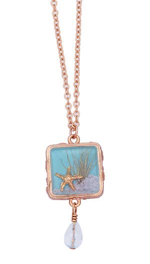 Genuine Sand and Dianthus with cast gold plated starfish set in Resin. Setting is pewter with 12 carat gold plating. Chain is 16" + 2" ext.