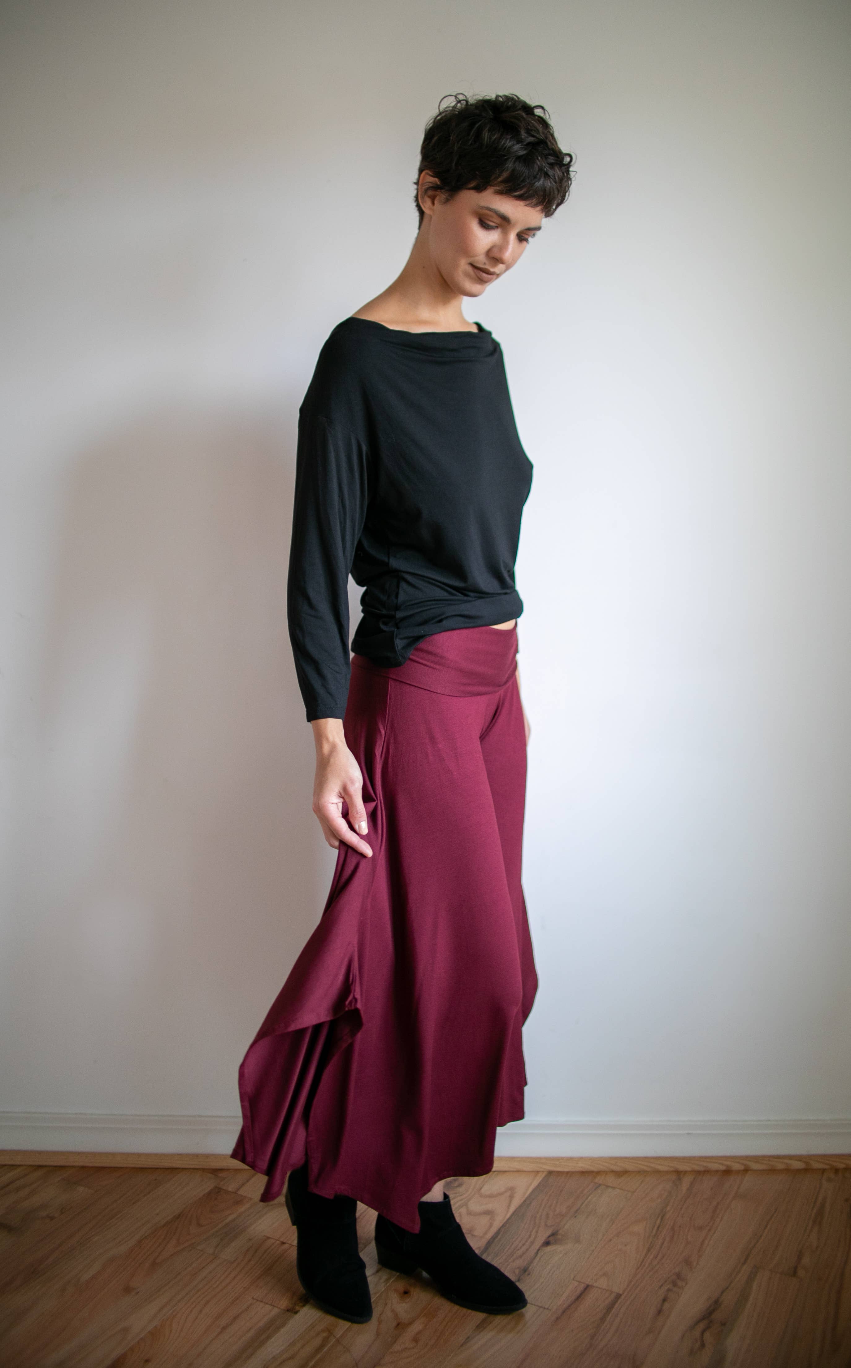 These ruched waistband wide-leg Gaucho pants are flattering to wear and elegant in design. A wide, flat band of slightly elasticized ruching gathers at the waist to create a stylish design detail and an attractive fit. The innovative design continues with a flared leg in diagonal styling and an open slit up the leg. Made from a deliciously soft fabric with wonderful stretch-and holds it shape well. Perfect for dance! Perfect for travel. Made from a deliciously soft fabric with wonderful stretch-and holds its shape well. This fabric is a very high-quality rayon lycra blend. Great attention to detail when creating each item guarantees long-lasting wear. When properly cared for, these clothes remain beautiful year after year. Care Instructions: Hand wash cold & hang to dry.