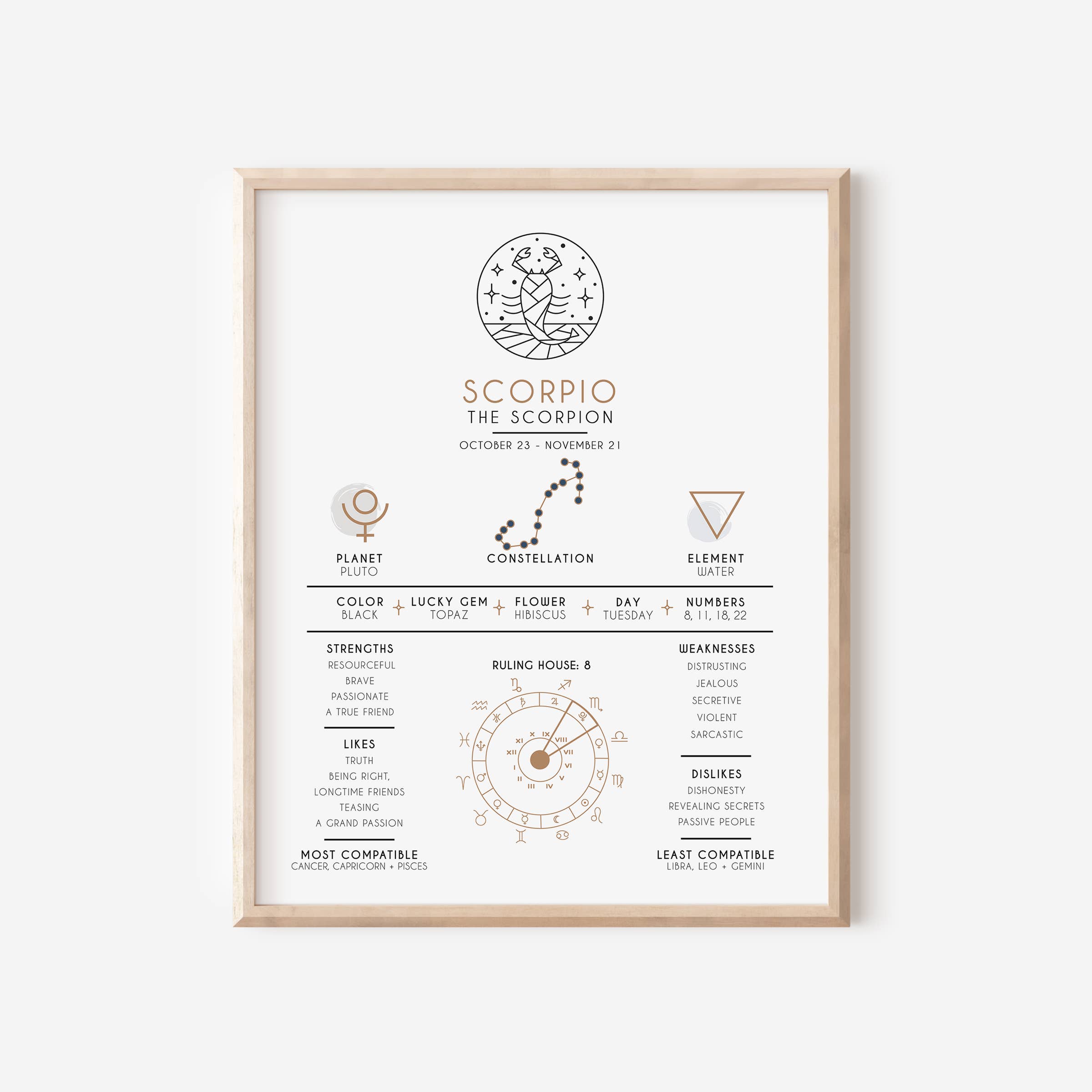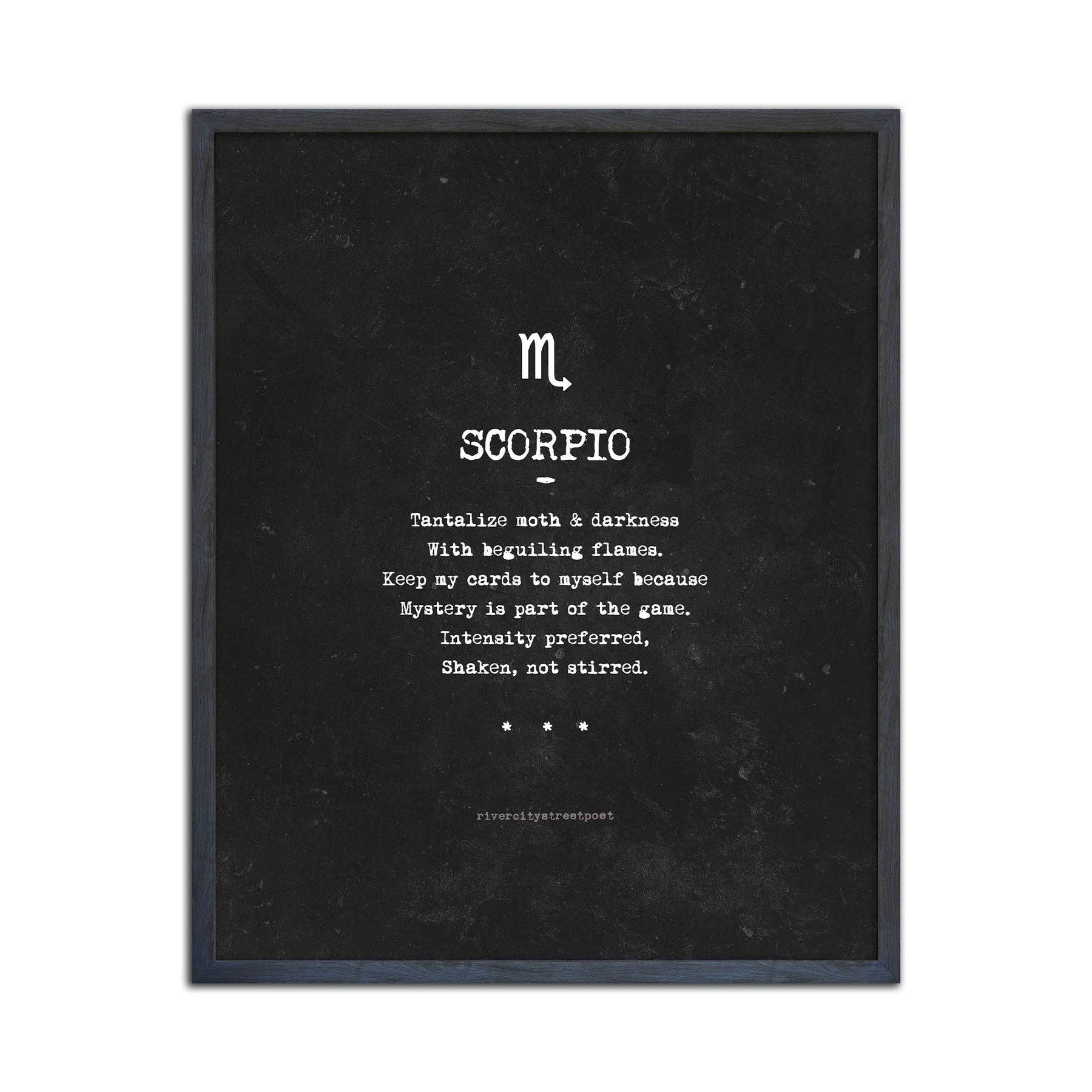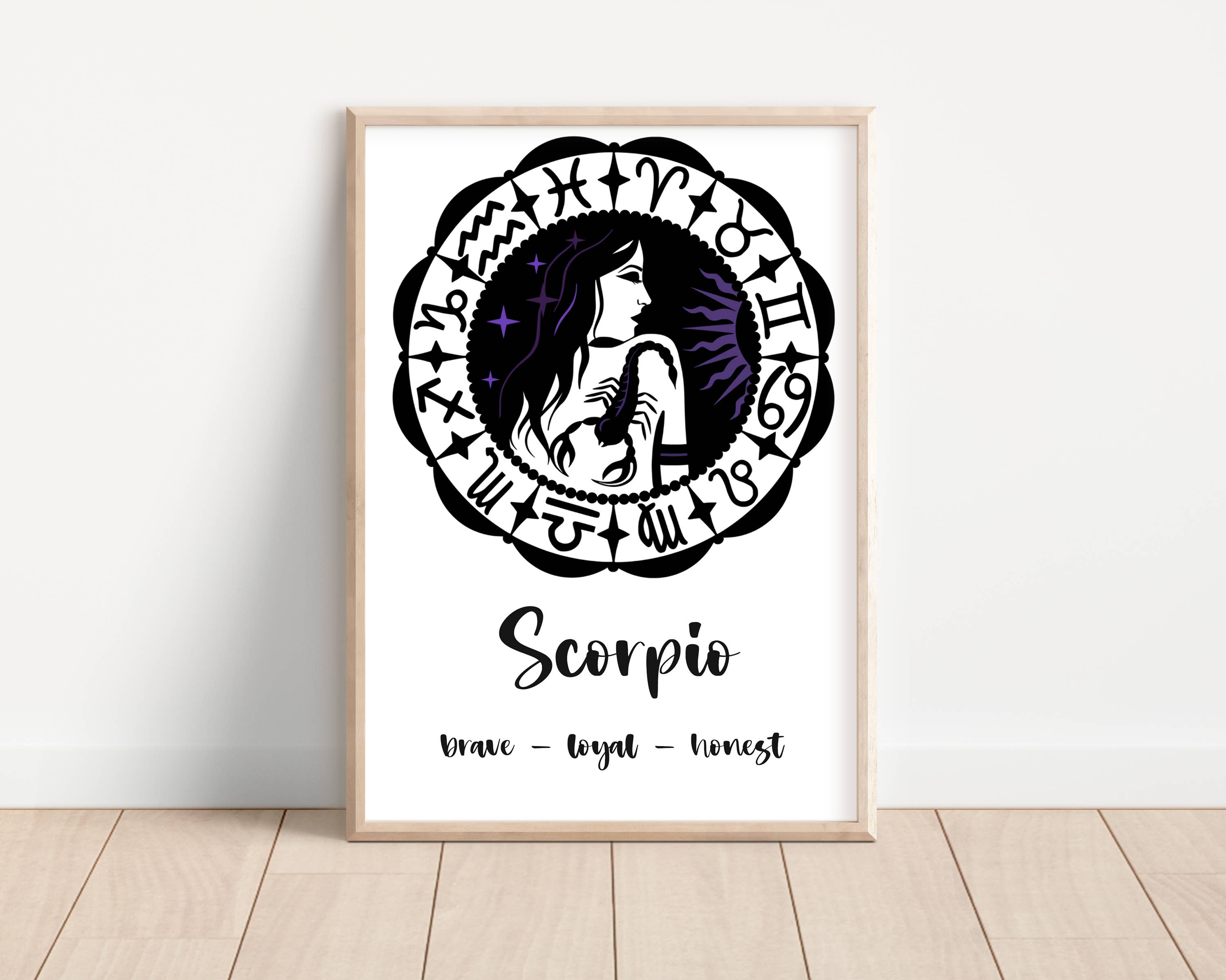 This beautiful Scorpio zodiac art print is perfect for your wall, office or home! It's a great educational piece that showcases the unique characteristics and personality traits of a Scorpio. This art print also features an illustration of the zodiac symbol, constellation, planet and element. Print is available in 8x10" or 11x14", see details below for more information. Don't forget to check out our Faire shop to shop all 12 Zodiac Art Prints! DETAILS • 8x10” or 11x14” in size • Printed on 110 lb premium matte paper • Packaged individually with a backing board + recyclable cello bag • See the last listing picture for a sample of the packaging!