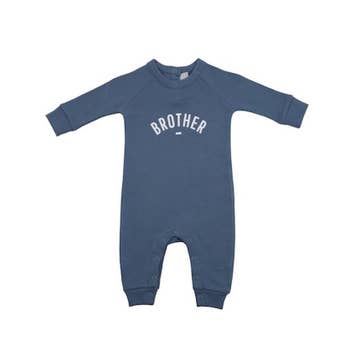 Custard cotton all-in-one featuring a white 'Brother' slogan. Our all-in-ones are long sleeved with a popper fastening at the back of the neck and on the inside leg. Available in sizes 0–3, 3-6 and 6–12 Months.