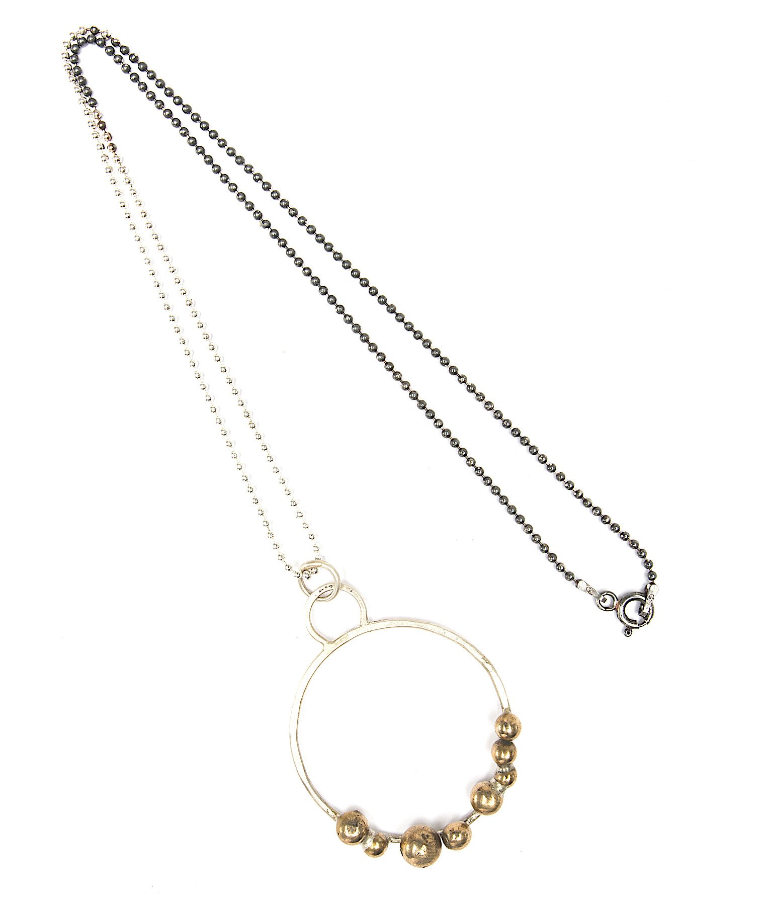 Pyrite nuggets, iridescent fabric appliqué, opal crystal, faux pearls, assorted antique gold and silver colored plated findings, chain and lobster clasp. Adjustable 15" - 17".